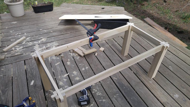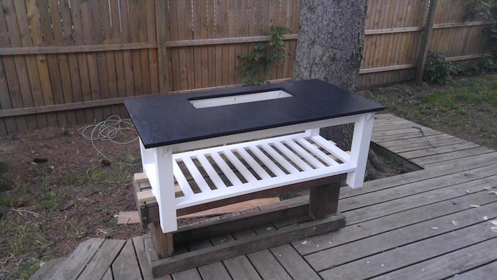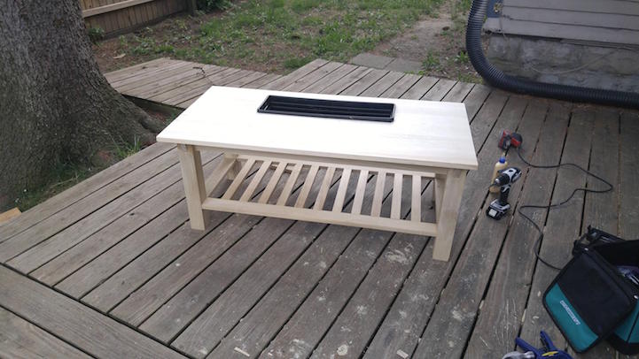 Alwyn Jones mérnök például sitty-sutty összedobta a csajának ezt a romantikus asztalkát, mert az szeretett volna valami rusztikus dizájnelemet a házba. És szerencsére ezt meg is osztotta velünk! Először teljesen egyedül összetákolta az asztal vázát, majd következett a trükk: egy virágládányi kivágott hely az asztallapon, amibe ugye – meglepetés! – a virágláda kerülhet.