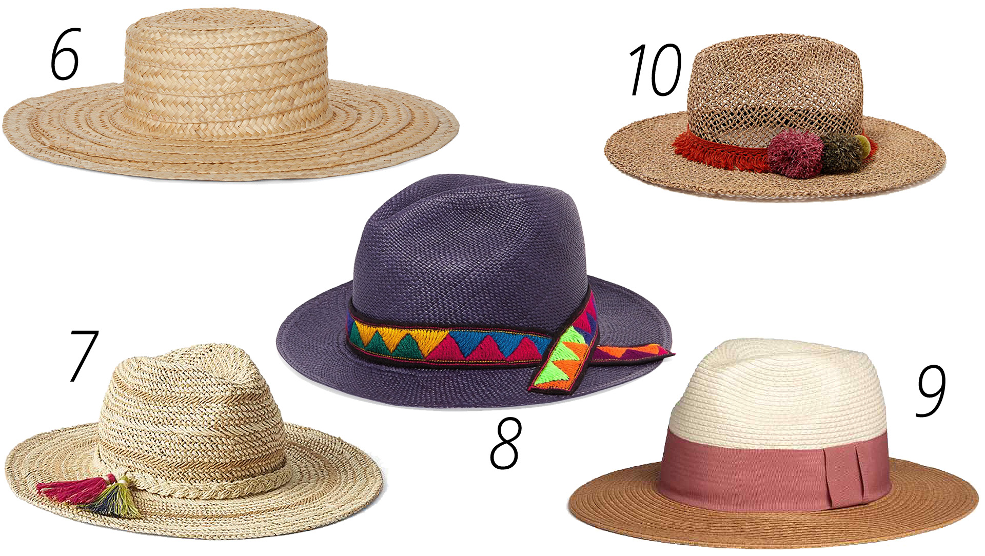 6. Amaya szalmakalap – Nanushka – 7. Színes bojtos fedora – Gap – 8. Sötétkék panama kalap – Sensi Studio 9. Raffia kalap pom-pom díszekkel – Zara – 10. Kétszínű szalmakalap mályva szalaggal – H&M
