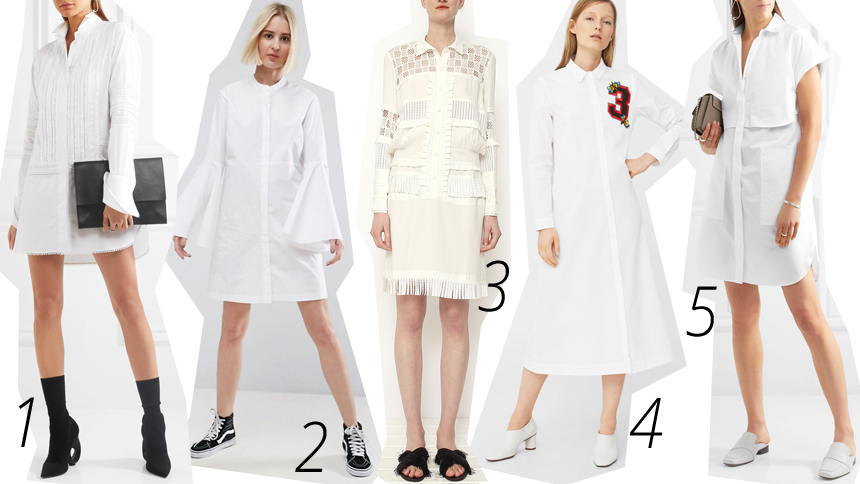 1. Csipkebetétes ingruha – Burberry / 2. Harangujjas miniruha – Asos / 3. Daro csipkebetétes ingruha – Use Unused / 4. Foltmintás ingruha – Mango / 5. Pamut-puplin ingruha – Rag&Bone