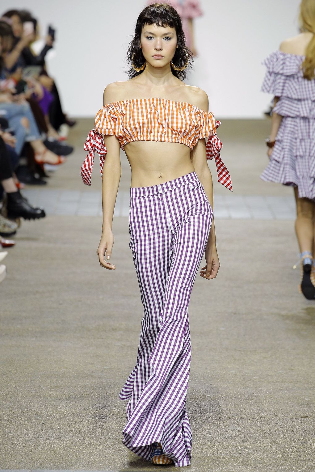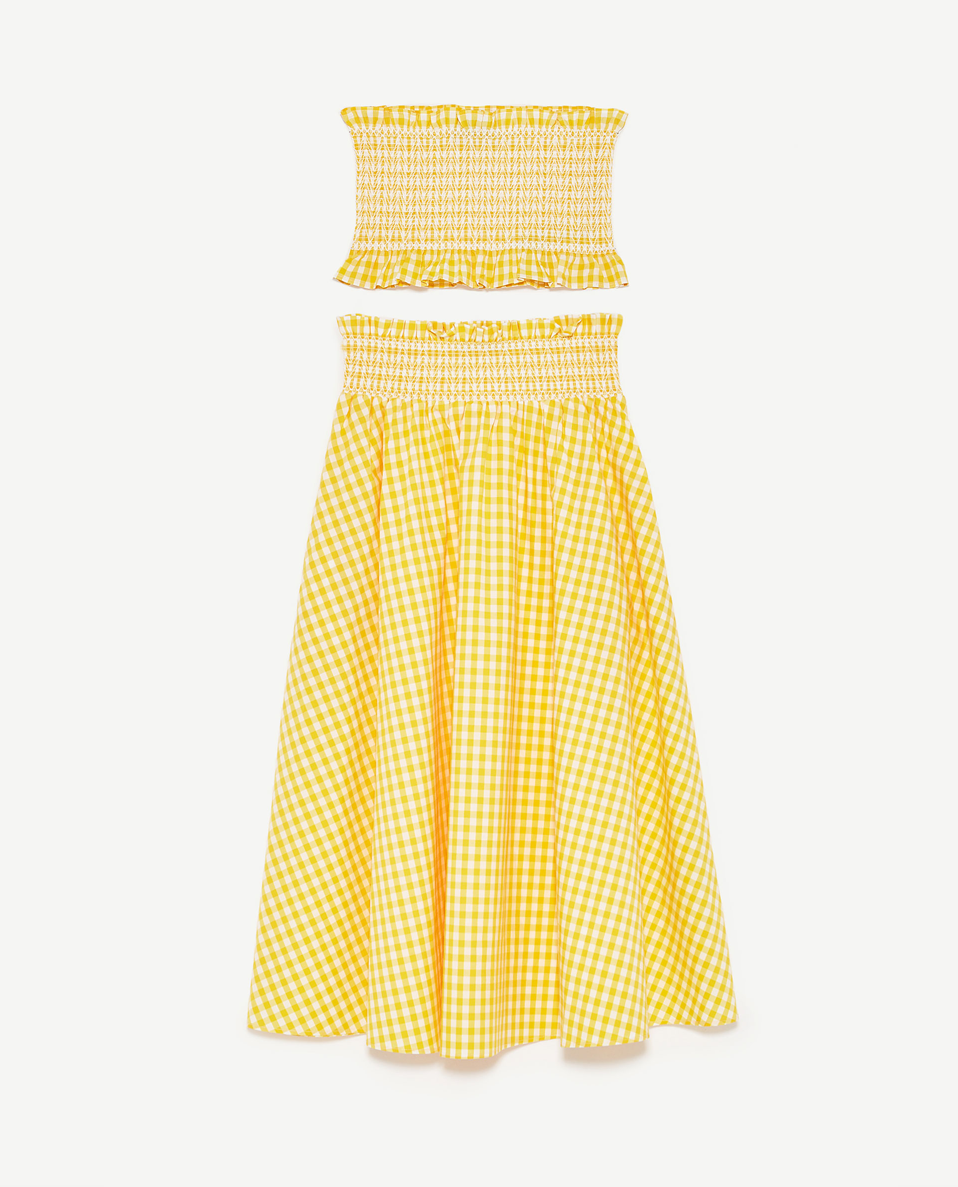 1. Sárga kockás együttes – Zara / 2. Vállakat szabadon hagyó szoknya – Topshop / 3. Virágmintás maxiszoknya – Sportmax / 4. Ejtettvállú, fodros ruha – House of Holland / 5. Kék-fehér kockás fodros ruha – H&M