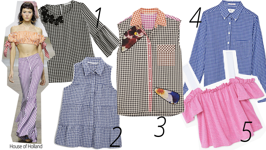 1. 3/4-es ujjú, virágdíszítéses – Promod / 2. Kék & fehér kockás ujjatlan ing – Next / 3. Foltmintás ujjatlan ing – Christopher Kane / 4. Her Madras gingham ing – Gant / 5. Vállra húzott vichy top – Mango