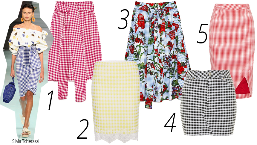 1. Fukszia kockás szoknya övvel – Zara / 2. Citromsárga ceruzaszoknya – Marc Cain / 3. Virágmintás gingham szoknya – Zara / 4. Fekete-fehér miniszoknya – Topshop / 5. Piros kockás ceruzaszoknya – Altuzarra