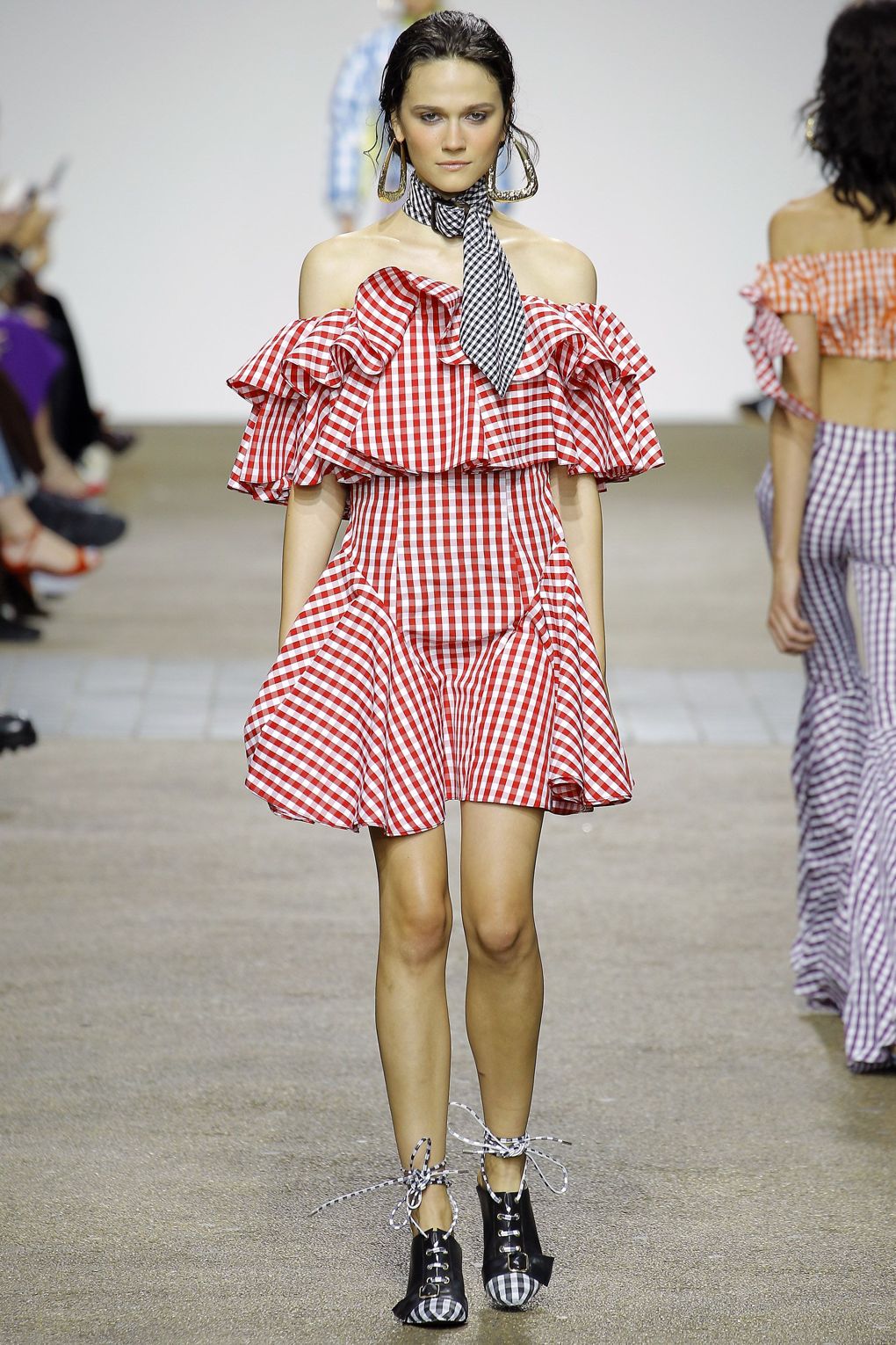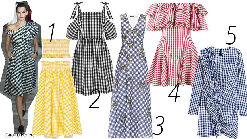 1. Sárga kockás együttes – Zara / 2. Vállakat szabadon hagyó szoknya – Topshop / 3. Virágmintás maxiszoknya – Sportmax / 4. Ejtettvállú, fodros ruha – House of Holland / 5. Kék-fehér kockás fodros ruha – H&M