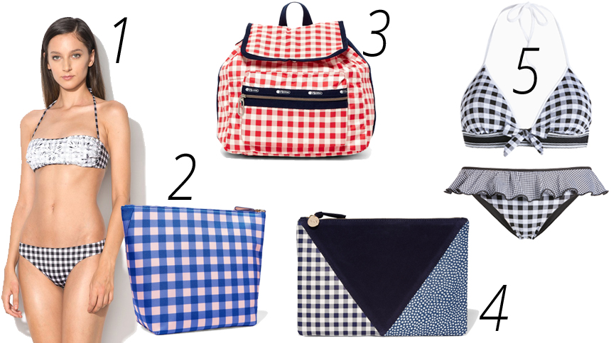 1. Virág rátétes bandeau bikini – Guess / 2. Origami gingham táska – Diane von Furstenberg / 3. Piros kockás hátitáska – Le Sportsac / 4. Patchwork mintás clutch – Clare V / 5. Kockás bikini – Twinset
