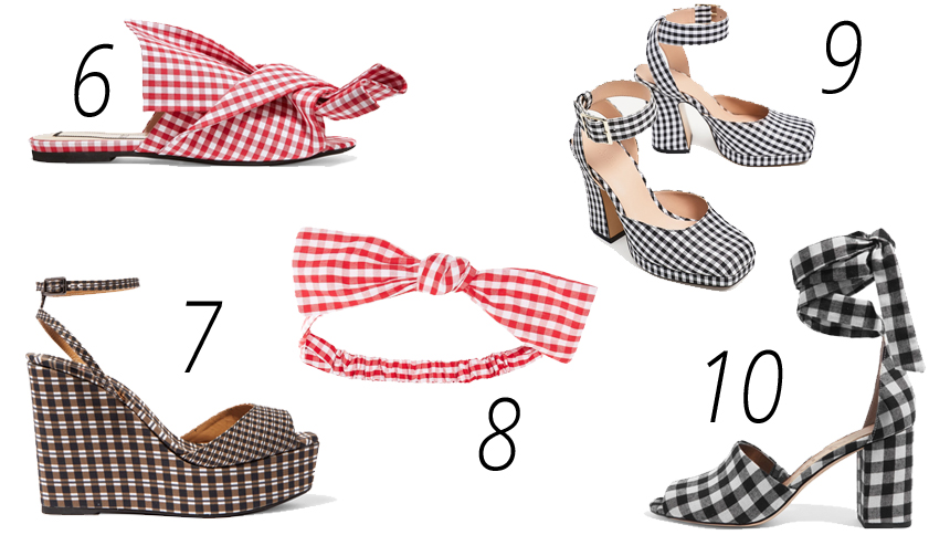 6. Piros kockás csomózott mintás papucs – No. 21 / 7. Zula barna kockás szandál – Castañer / 8. Masnis fejpánt – Topshop / 9. Magassarkú, elöl zárt szandál – Zara / 10. Odele gingham mintás szandál – Sam Edelman