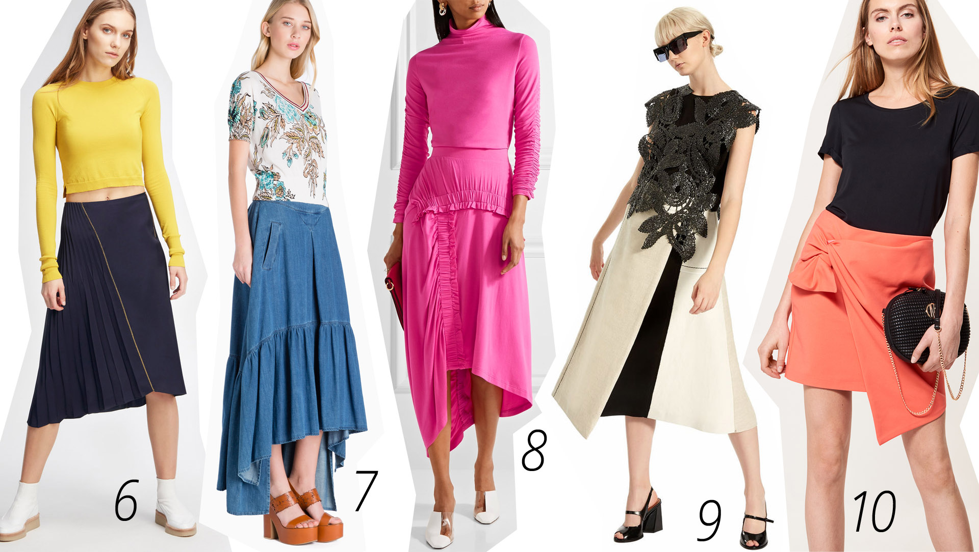 1. „Lala” fekete selyem szoknya – Konsanszky / 2. „Cody” asszimetrikus rétegekből álló csíkos szoknya – Opening Ceremony / 3. Virágmintás, fodros szoknya – Promod / 4. Piros-fehér midi szoknya bojtos övvel – La Lignet / 5. Fodros aljú, tengerzöld szoknya – Zara
