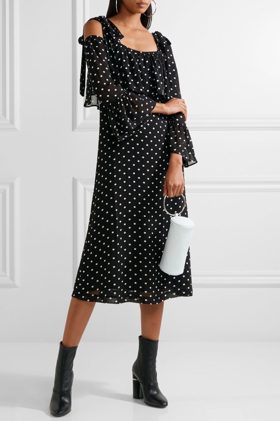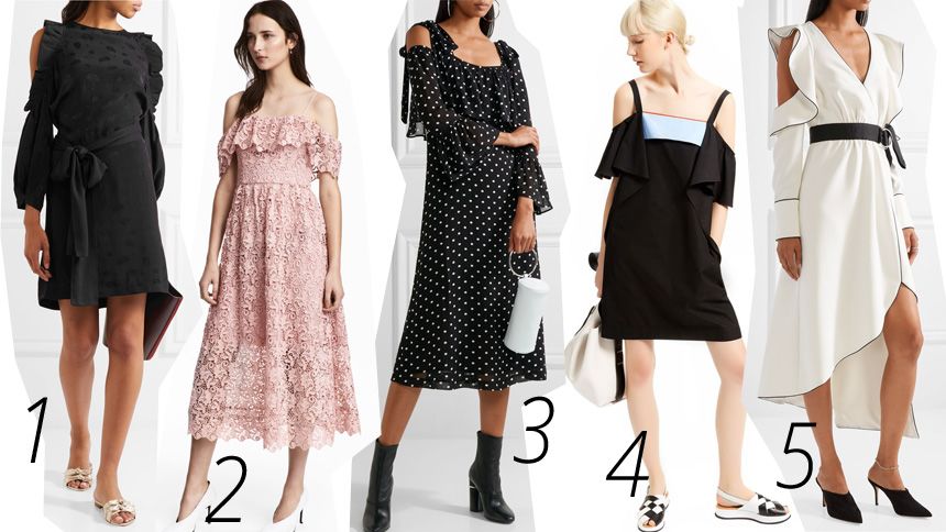 1. Fodros, fekete miniruha – Maje / 2. Fekete alapon fehér pöttyös midi ruha – Ganni / 3. Vállrész nélküli csipkeruha – H&M / 4. Fodros ujjú fekete ruha élénk kék betéttel – Sportmax / 5. Fehér aszimetrikus ruha, fekete övvel – Self-Portrait