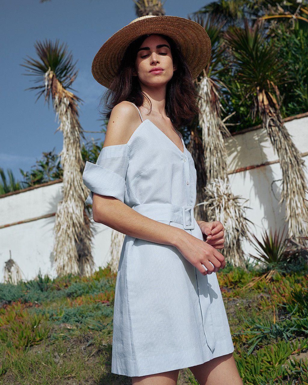 6. – Fekete-fehér mintás, fodros ruha – DKNY / 7. Bordás anyagú fekete ruha, puffos, fehér ujjrésszel – Zara / 8. Kék-fehér pizsamacsíkos ingruha – Nanushka / 9. Virágmintás halványkék ruha – Mohito / 10. Fedetlen vállú ruha, mellrésznél csipkebetéttel – Promod