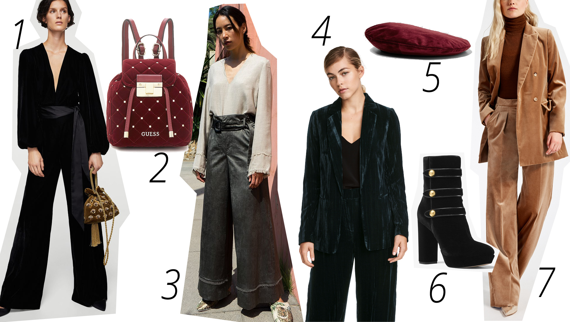 1. Bársony overál övvel – Mango / 2. Cornelia mini hátitáska – Guess / 3. Piszkoszöld bőszárú nadrág – Nanushka / 4. Sötétzöld törtbársony blézer – H&M / 5. Bordó barett sapka – Zara / 6. Díszgombos magassarkú bokacsizma – Michael Kors / 7. Bársony nadrág és blézer – Max Mara