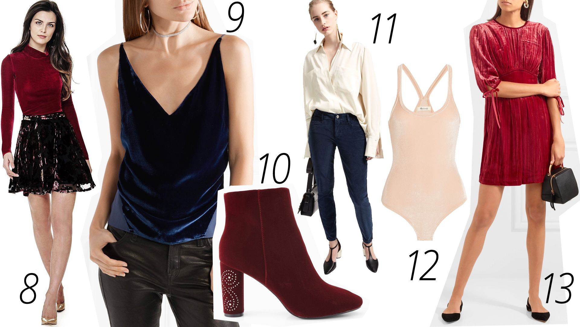 8. Bársony virágokkal díszített miniszoknya – Guess / 9. Lucy spagetti pántos top – J Brand / 10. Bordó bokacsizma – Promod / 11. Kordbársony skinny farmer – Sportmax / 12. Púderrózsaszín bársony body – Madewell / 13. Ráncolt bársonyruha masnikkal – Alexachung