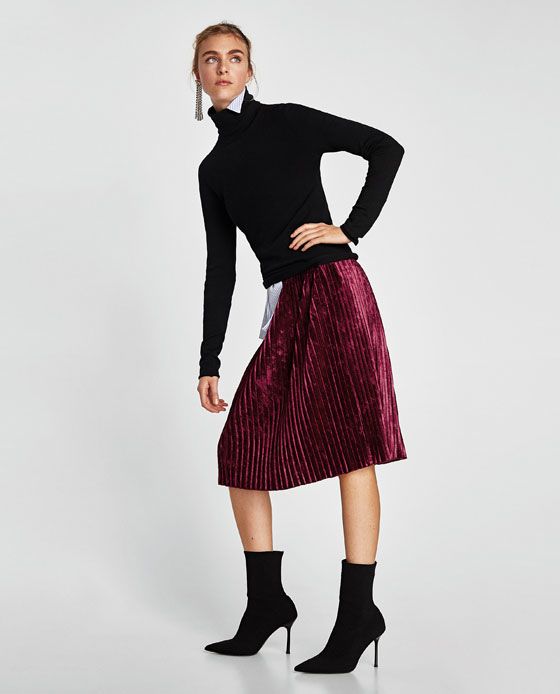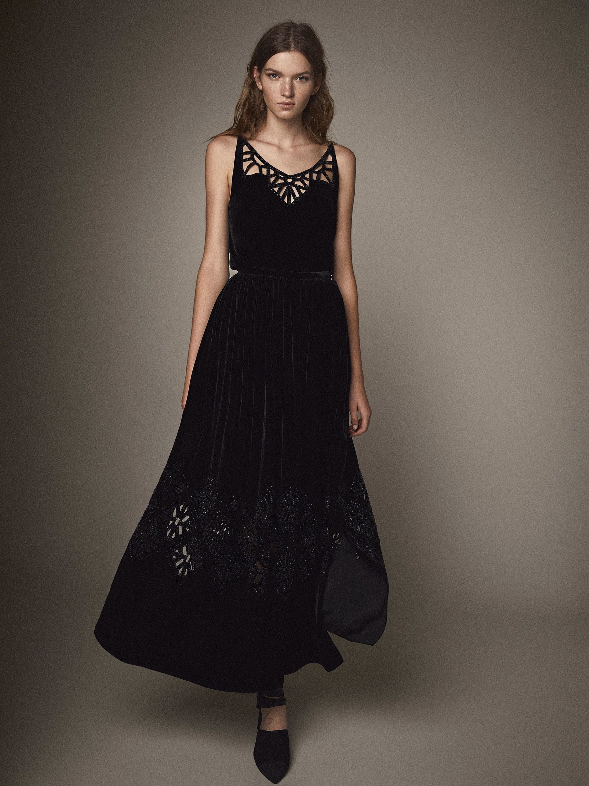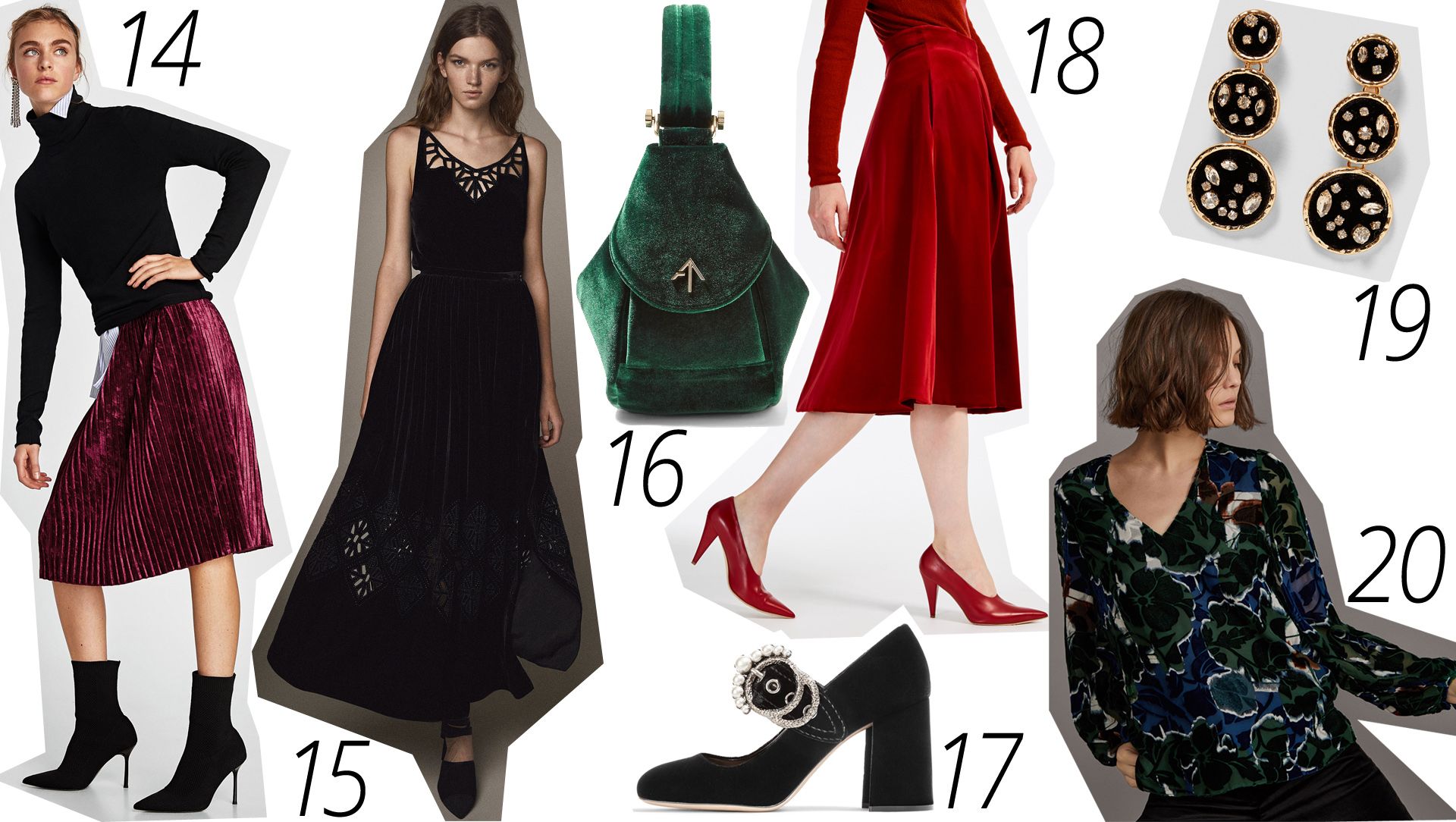 14. Burgundi színű rakott szoknya – Zara / 15. Hosszú bársonyruha lyukacsos díszítéssel – Massimo Dutti / 16. Zöld bársony clutch – Manu Atelier / 17. Díszcsatos pumps – Miu Miu / 18. Gioia piros bársonyszoknya – Max Mara / 19. Kövekkel díszített bársony fülbevaló – Zara / 20. Bársony virágokkal nyomott felső – Massimo Dutti