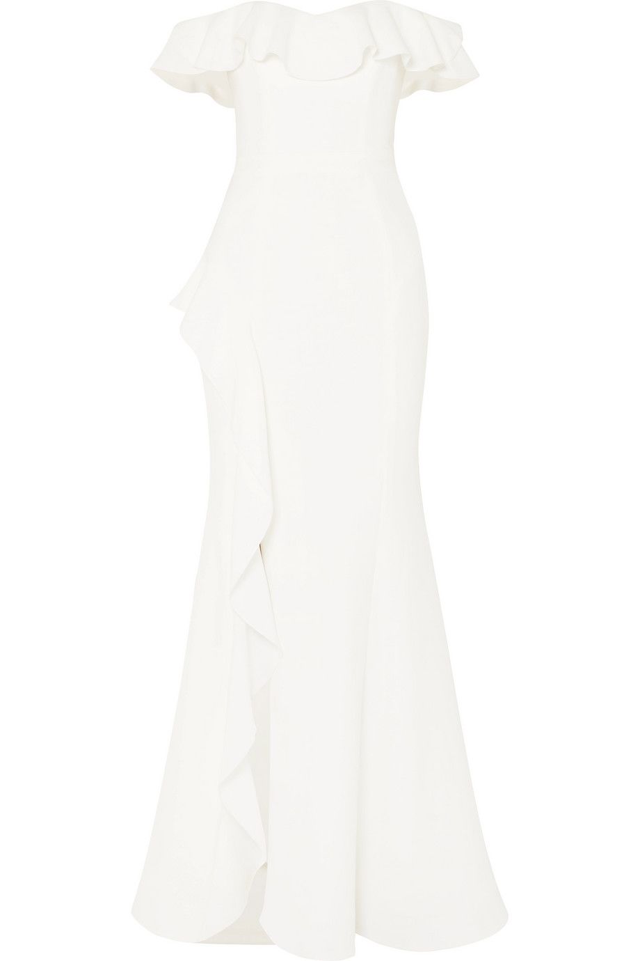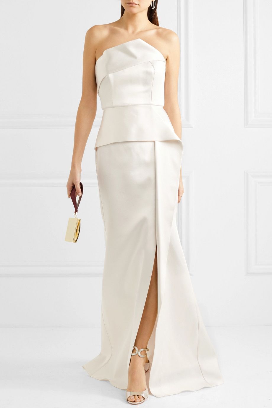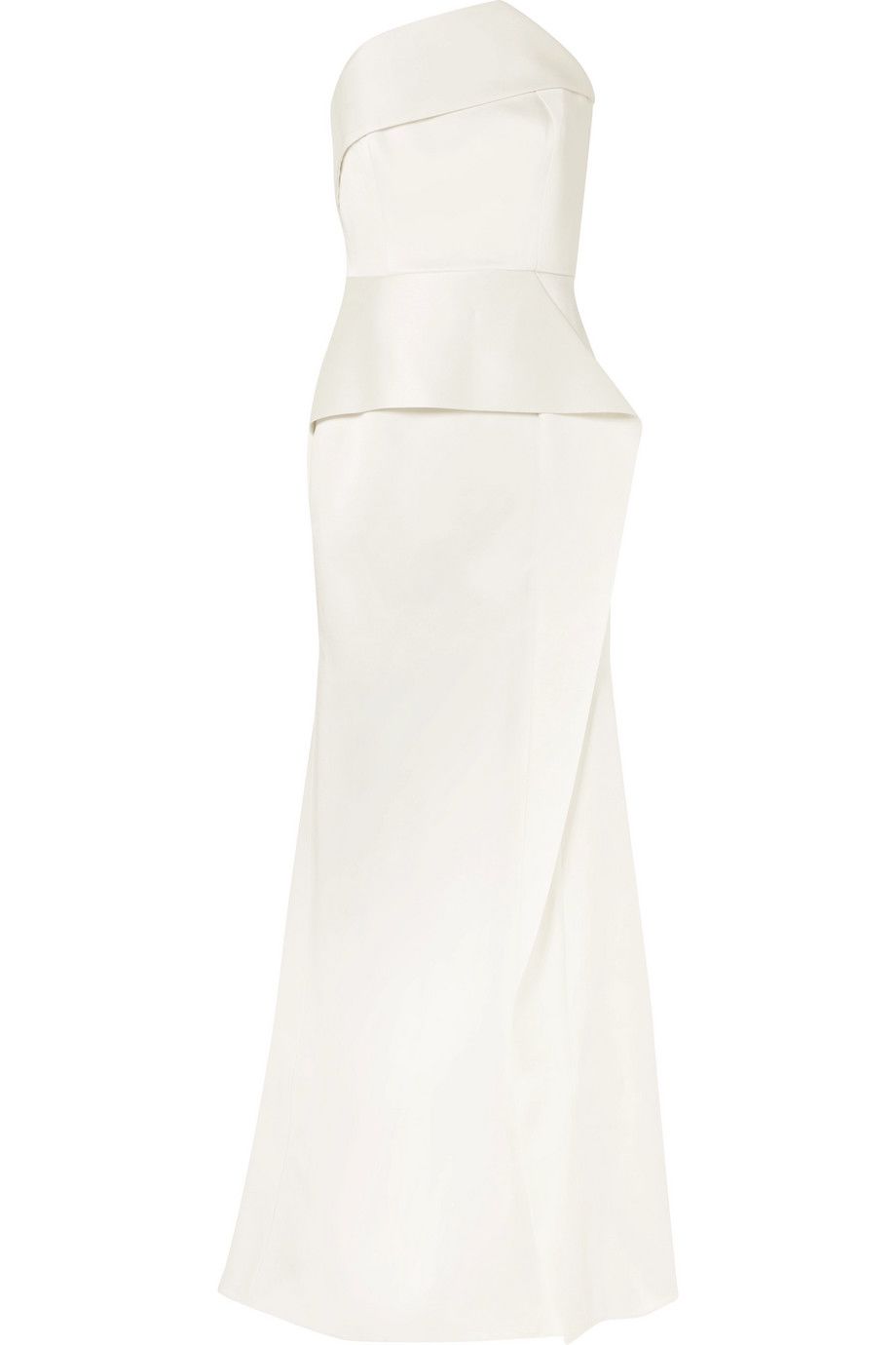 Eddigre már biztosan látszik, nehezen tudjuk Claut habos-babos menyasszonyi ruhában elképzelni, sokkal inkább a fénylő selyem illik hozzá, csili-vili részletek helyett pedig az egyedi, mégis alakját kiemelő szabásvonalak irányába indulnánk el. Épp ilyen Roland Mouret pánt nélküli esküvői ruhája, amelyet felsliccelt fazonja még inkább esélyessé tesz.