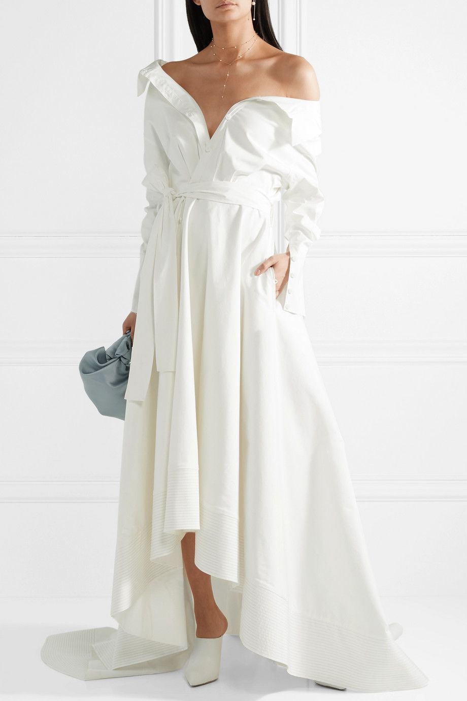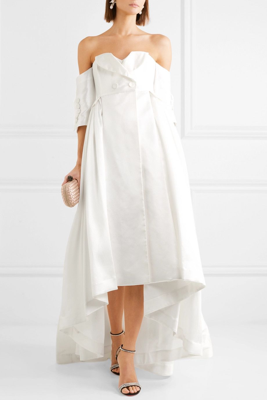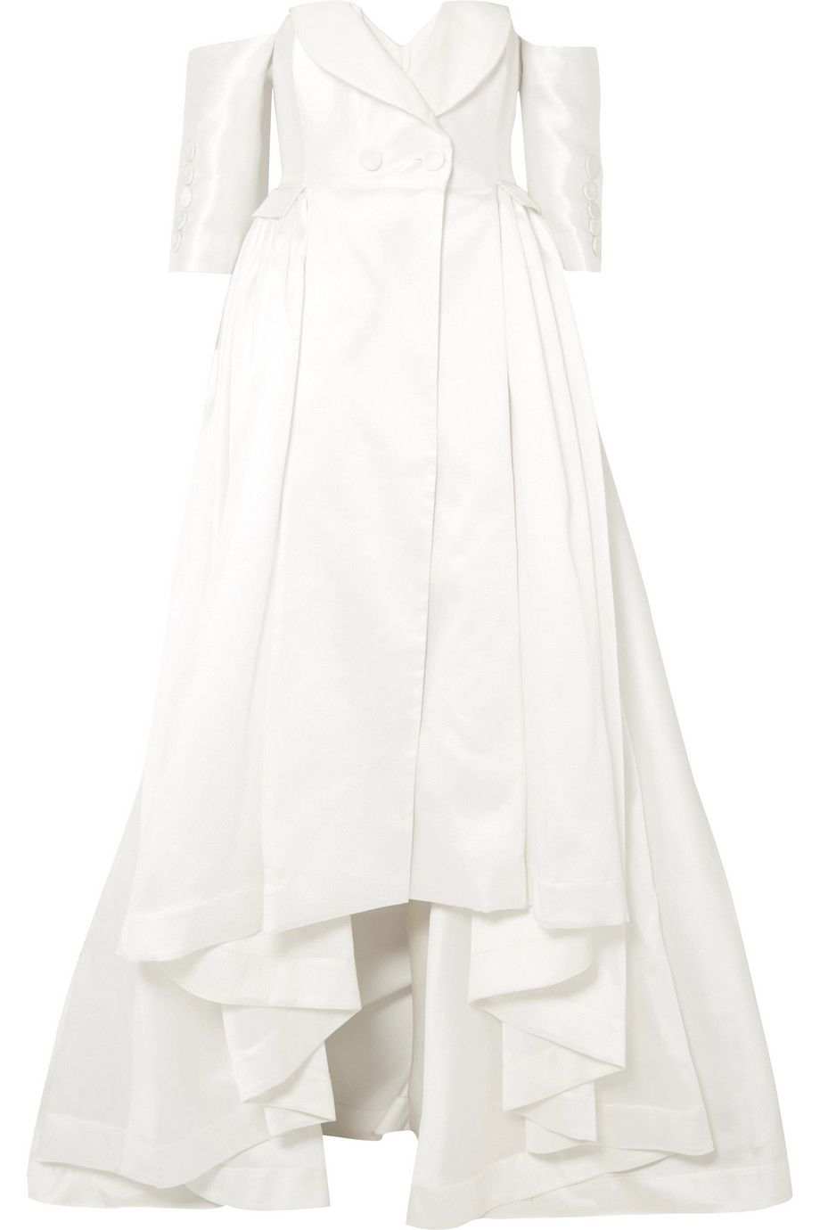 Eddigre már biztosan látszik, nehezen tudjuk Claut habos-babos menyasszonyi ruhában elképzelni, sokkal inkább a fénylő selyem illik hozzá, csili-vili részletek helyett pedig az egyedi, mégis alakját kiemelő szabásvonalak irányába indulnánk el. Épp ilyen Roland Mouret pánt nélküli esküvői ruhája, amelyet felsliccelt fazonja még inkább esélyessé tesz.