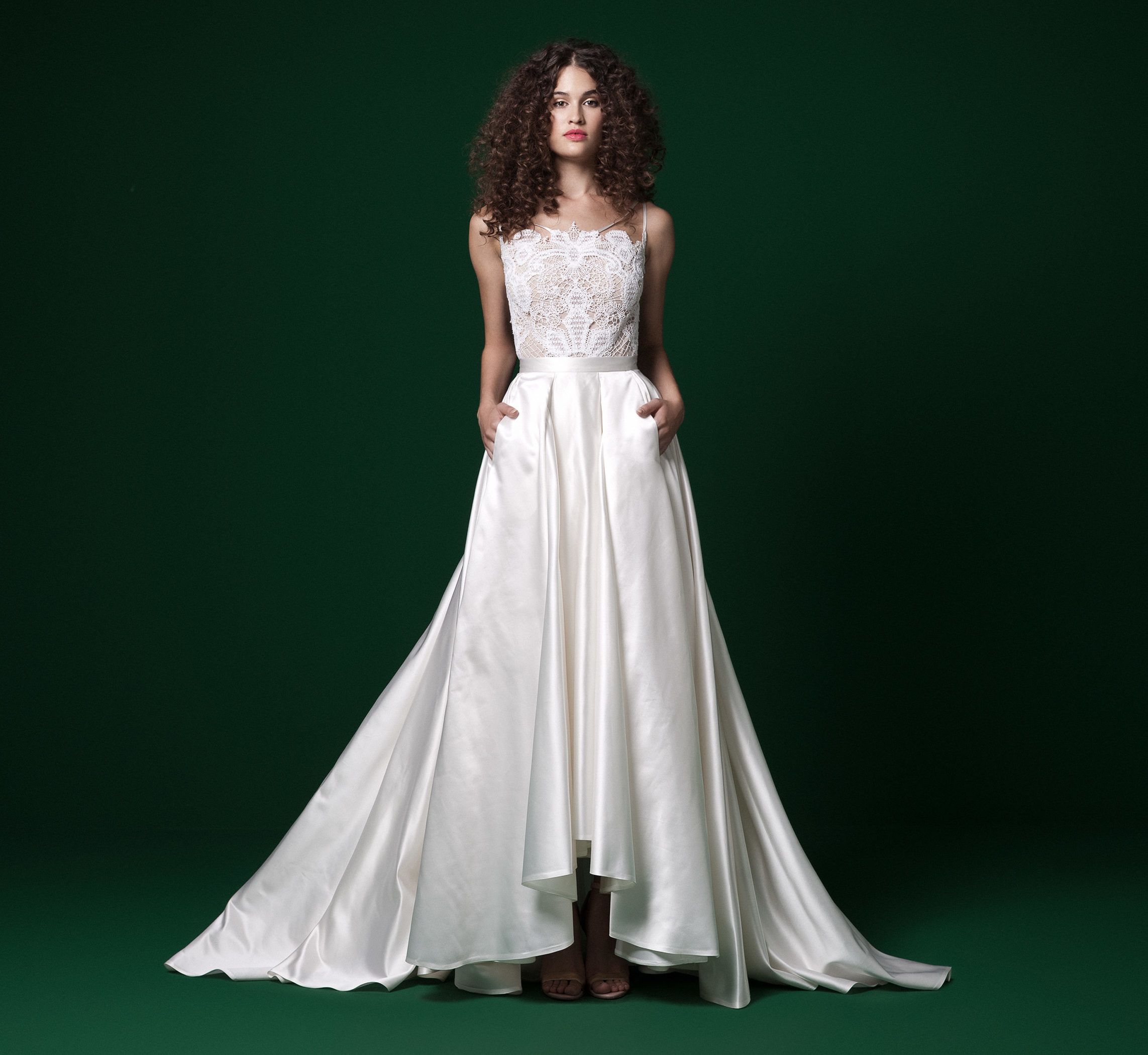A Daalarna Paradise kollekciójában is találtunk két claudiás darabot. Ezek ugyan nincsenek mélyen kivágva, de úgy gondoljuk, a fénylő selyemből készült, enyhén bővülő, aszimmetrikus szoknya remekül állna a műsorvezetőnőn, és 45 évesen az egyenes vonalú nyakkivágásnak is megvannak a maga előnyei. Az első ruha kétrészes jellege igazán modernné tenné a megjelenését, a második pedig a vékonyka pánttól különleges. Bár Claudia nem sokszor visel csipkével díszített ruhákat, szerintünk a nagy napon ennyi még beleférhet.