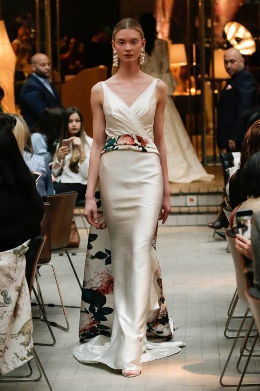 Mivel ez már Claudia második házassága, könnyen lehet, hogy nem ragaszkodott a hófehér menyasszonyi ruhához, és helyette belecsempészett némi mintát vagy színt az outfitbe. A szűkített, nőies fazonok remekül kiemelik homokóraalkatát, így egy ilyen virágos uszályos Sachin & Babi fénylő selyem ruha is csodásan állna rajta, sőt a trükkös kis részletek – gondolunk itt a pici peplumra és a felsőrész kialakítására – még előnyösek is lennének számára.