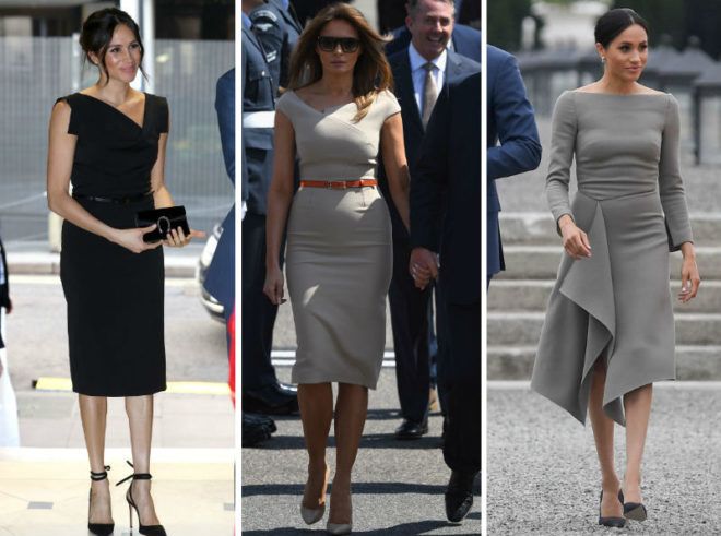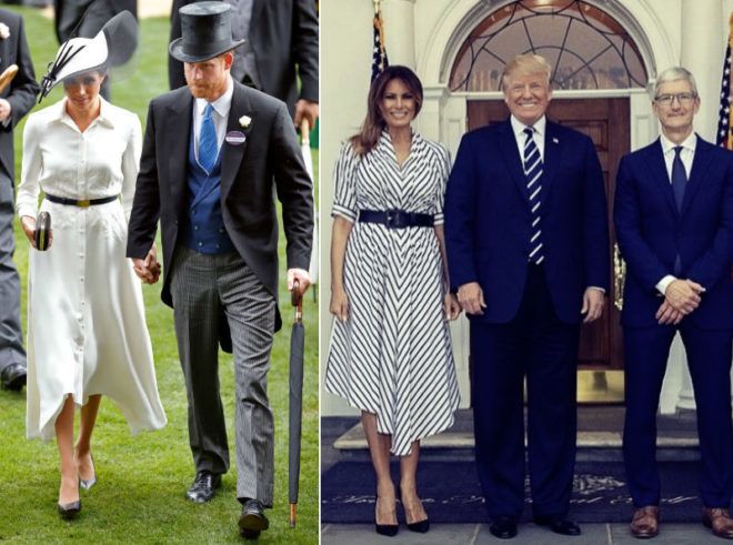 Július közepén Melania egy Roland Mouret midiruhában érkezett meg Londonba férjével. Ugyanattól a tervezőtől választott egy hasonló árnyalatú kreációt, mint pár nappal korábban Meghan hercegné, írországi látogatásán. A ruha aszimmetrikus kivágása és szabásvonala pedig azt a Black Halo ruhát idézte, melyet Markle egy fogadáson viselt még áprilisban.
