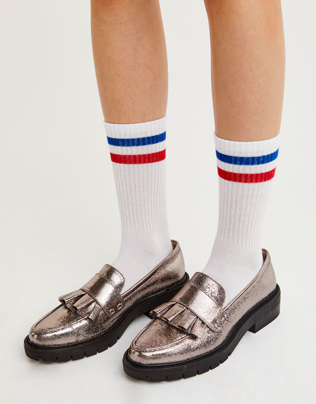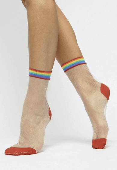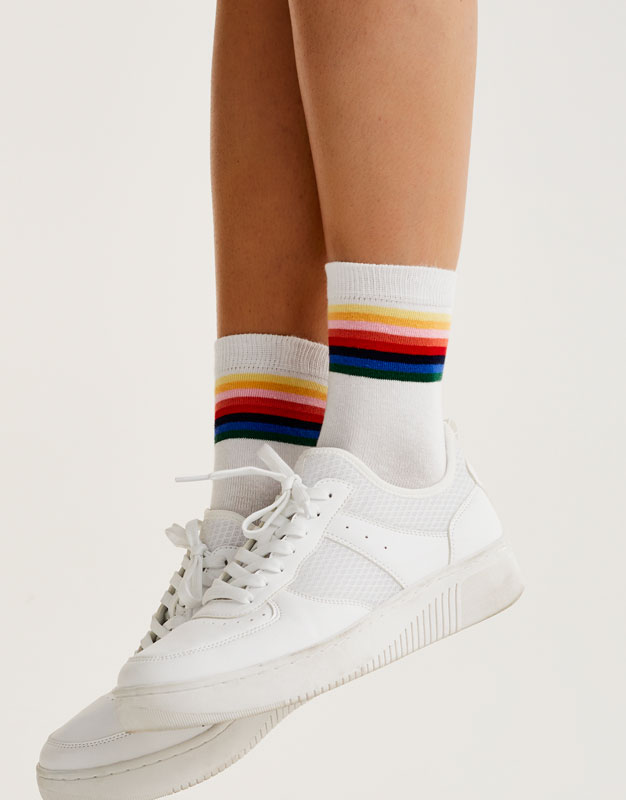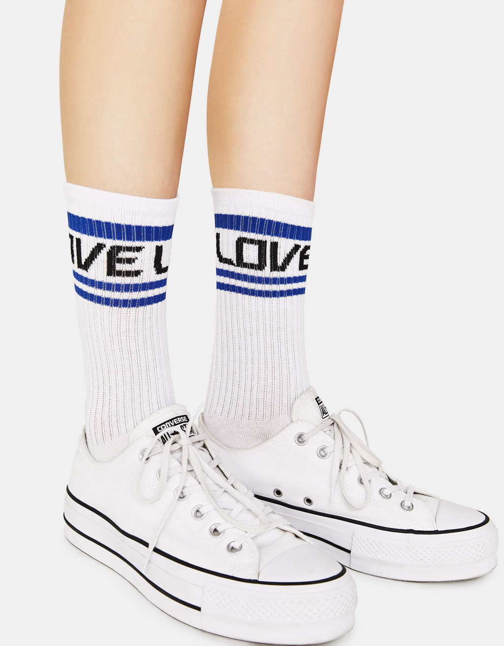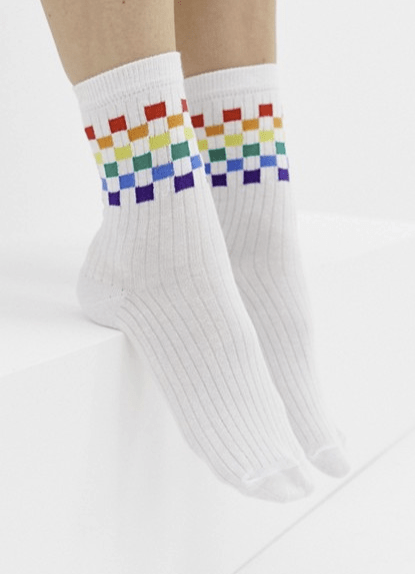 Ezeket a régi teniszzoknikra emlékeztető, fehér alapon mintás darabokat kizárólag teljesen felhúzva szabad viselni. Ha igazán bátor vagy, akkor válaszd belőle a térdzokniváltozatot!
