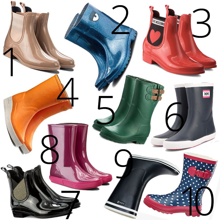 6. Sötétkék gumicsizma hajós stílusban – Helly Hansen / 7. Fekete gumibetétes bokacsizma – Gioseppo / 8. Letisztult lila – Furla / 9. Fehér szegélycsíkokkal díszített – Decathlon / 10. Csatdísszel ellátott pöttyös gumicsizma – Deichmann