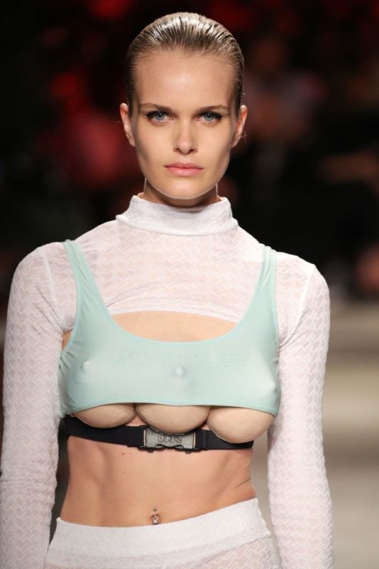 A modellek nem a két saját mellük közé kaptak egy harmadikat, hanem három darab műmellet applikáltak a mellkasukra, melyek sportmelltartók alól kandikáltak ki.
