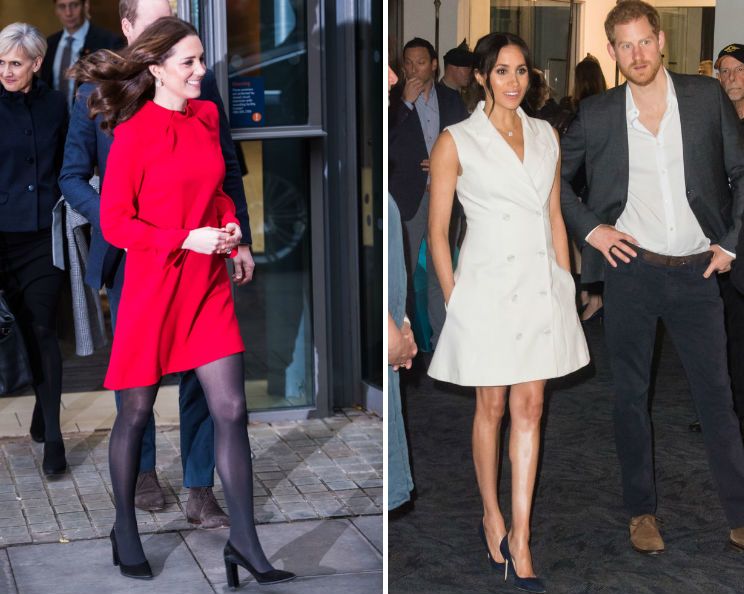 Katalin hercegné a rövidebb ruhákat általában sötét, vastag harisnyával viselte, Meghan viszont múlt héten csupasz lábakkal is bevállalta a térd fölé érő ruhahosszt.