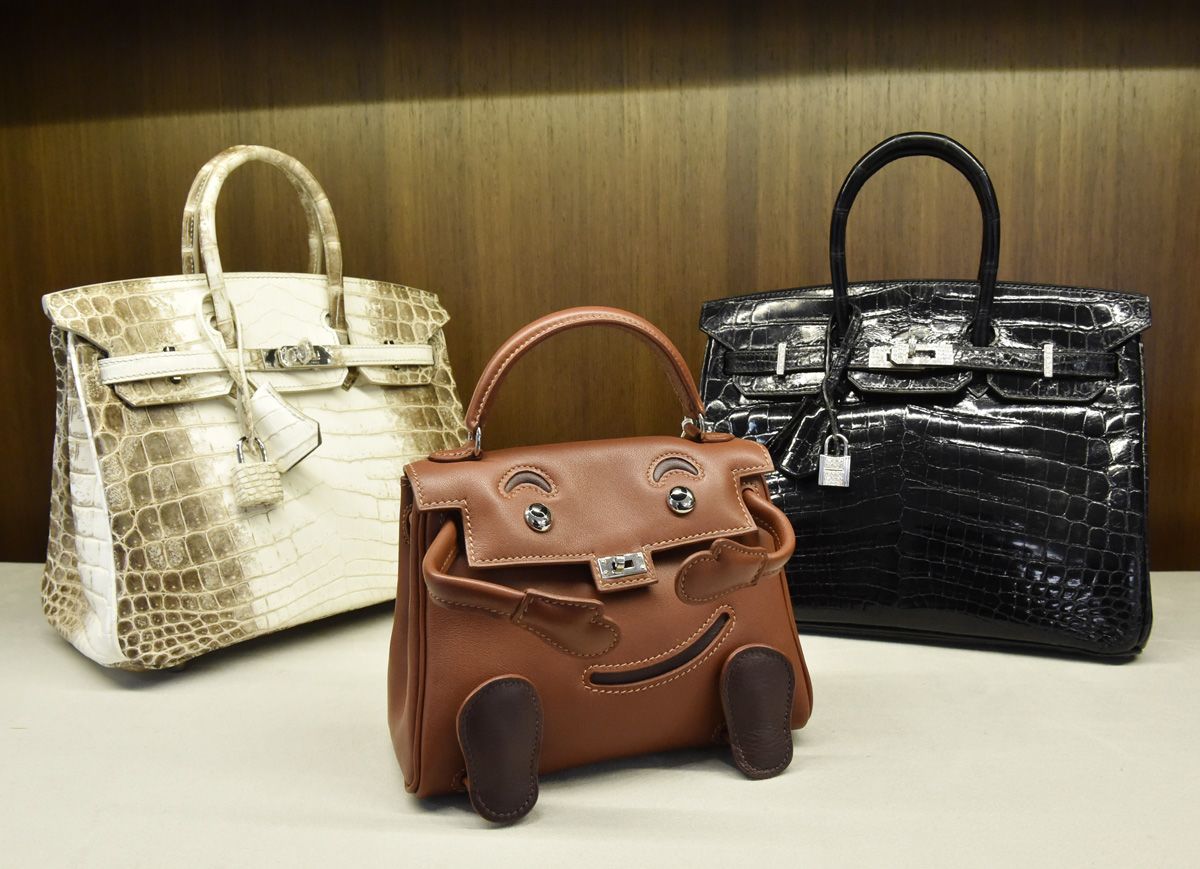 Hermès táska ritkaságok: 25 cm-es matt fehér, himalájai krokodilbőrből készített Birkin táska fehér palládiumrátétekkel, egy limitált kiadású Noisette Gulliver bőr Quelle Idole Kelly táska és egy Hermès Extraordinary Collection 25 cm-es fényes fekete, nílusi krokodilbőrből készített Birkin, amit 18 karátos fehérarany rátétek és gyémántok díszítenek (Fotó: AFP)