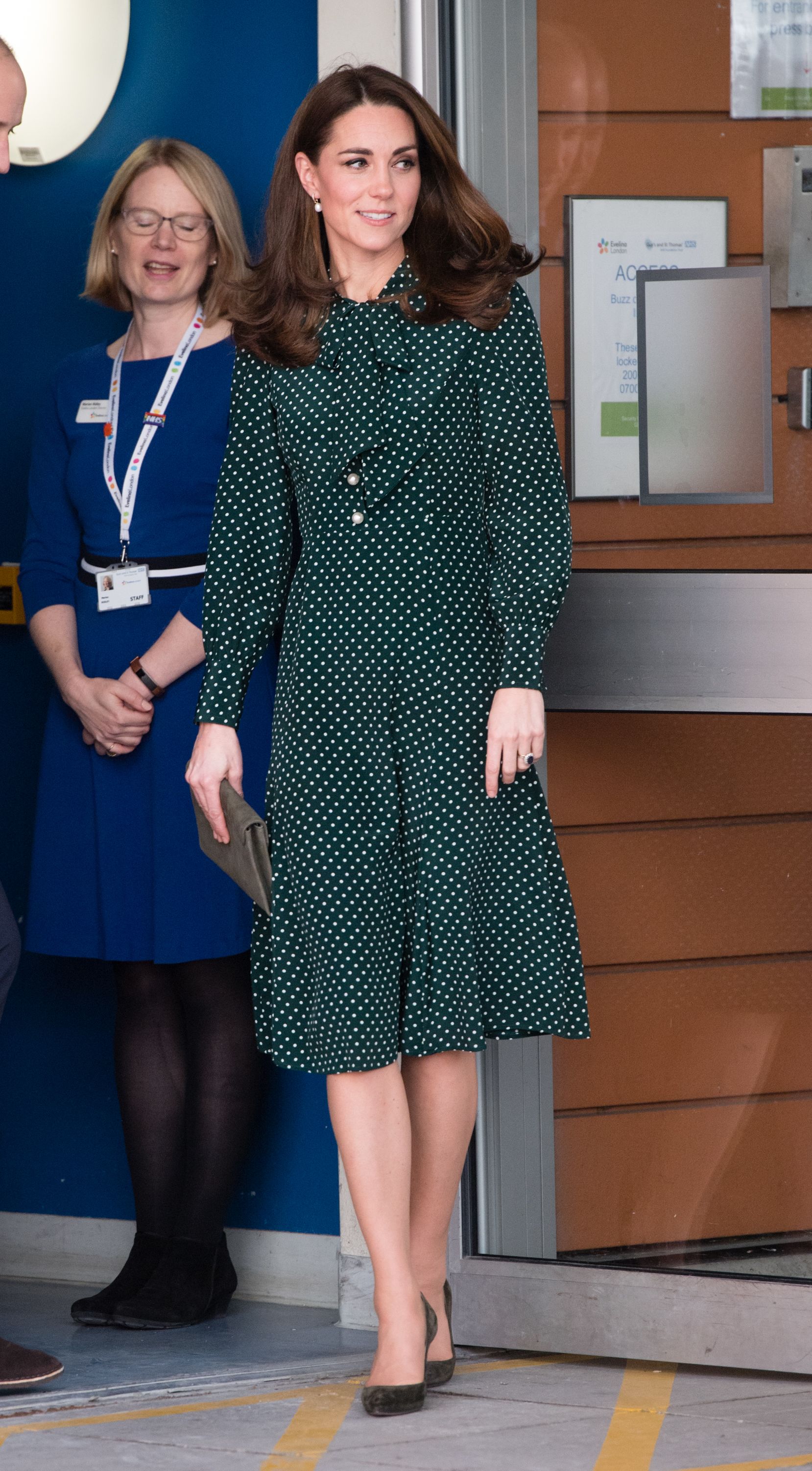 Pöttyös ruha nélkül nem is lenne teljes a válogatás, hisz Katalin hercegné rajong értük, mostanság pedig határozottan rákattant ezekre a csinos darabokra. A minap egy sötétzöld alapon fehér pöttyös LK Bennett ruhát viselt az Evelina-gyermekkórházban tett látogatása során.