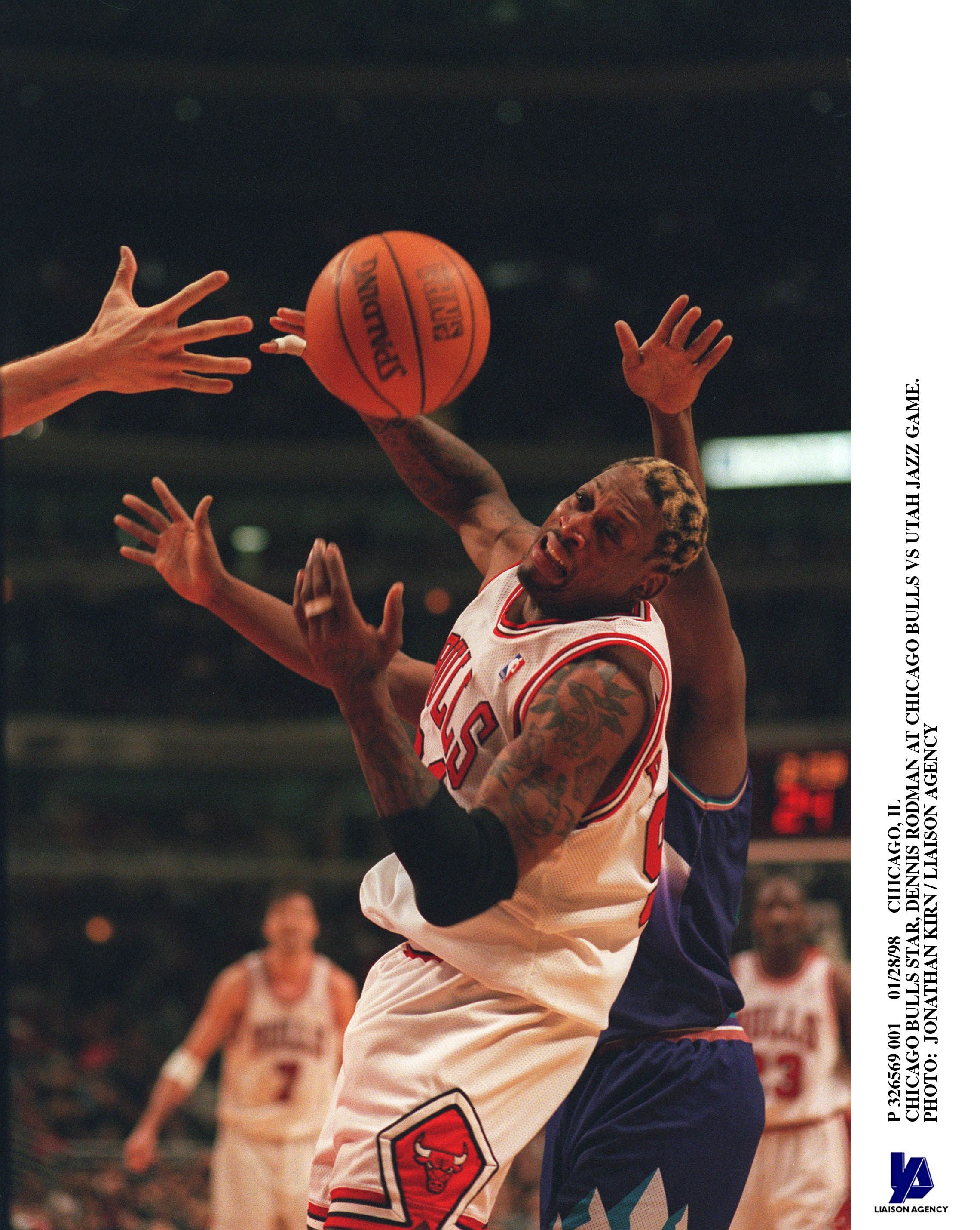 Dennis Rodman a Chicago Bulls játékosa 1998-ban, leopárdmintás hajjal (Fotó: Jonathan Kirn/Getty Images)