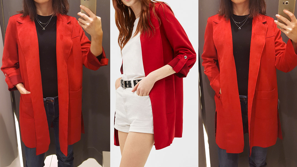 Művelúr szekcióban ez a fuksziaszínű blézer volt a kedvencem, ami élőben valóban olyan szép, élénk színű, mint a webshopos képen – nálam sajnos az öltözős szelfi rontott az árnyalatokon. Nemcsak a szín, a fazon is rendben volt, a hajtóka szépen kifeküdt, a rávarrt zsebek is feldobták, de a legjobb mégiscsak az ujjmegoldás volt, ami egy patenttal felcsatolható. Ez jó kis plusz látványelemet adott a kabátkának.