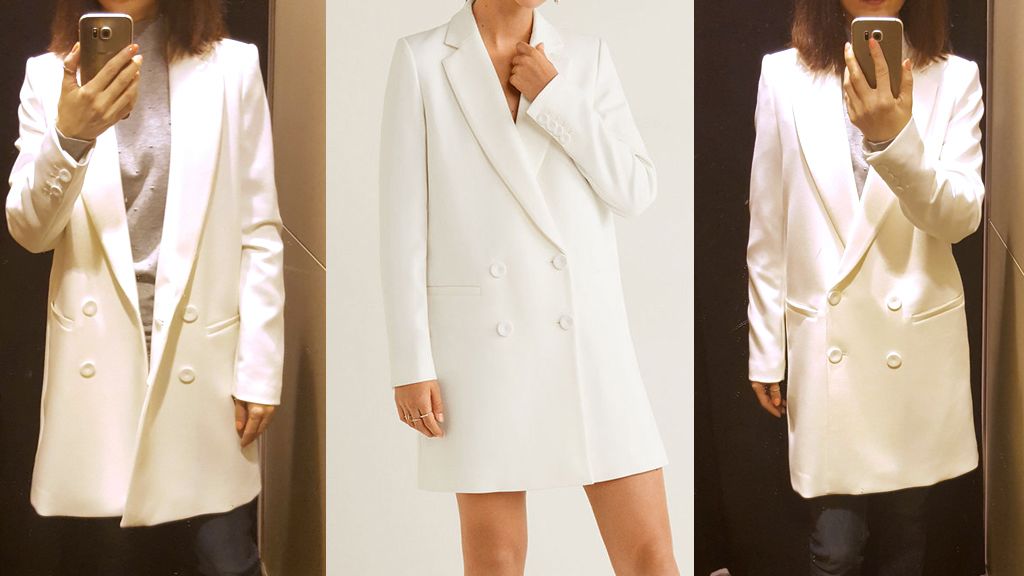 Ennek a dupla gombsoros kabátnak első pillantásra megnyerő volt az anyaga, egyenes szabása és a frakkoktól kölcsönzött hajtókája pedig kellő extrát nyújtott hozzá, hogy felpróbáljam. Begombolt állapotához sajnos alkatilag kevéske vagyok, nyitott változatban azonban abszolút el tudnám képzelni magamon – na nem a szürke pulcsimmal. Gyönyörű hófehér színe van, a méretezést illetően próbát tennék az egyel kisebbel is, az ujja például túl hosszú volt (rajtam az S-es látható). A zsebek sajnos csak dekorációk, mindössze két bevarrt csík fut kétoldalt.