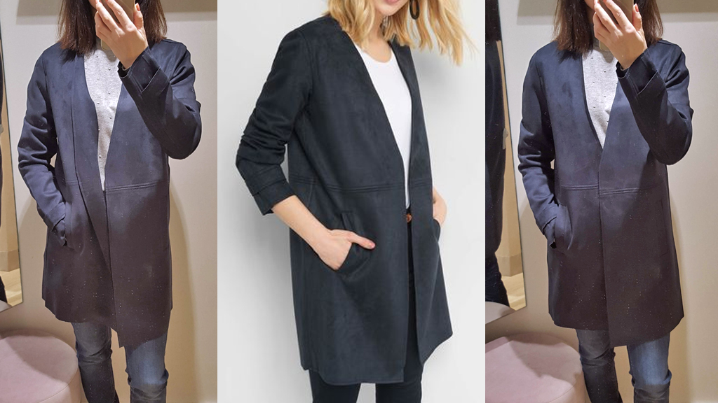 Ez gombok és öv nélküli, egyenes fazonú kabátka gyakorlatilag egy jól szabott kardigán, csak épp anyagában extrább, kötött helyett a most divatos ökovelúrból készült. Hajtókája nincs, mondhatni teljesen sallangmentes, mégis jópofa darab. Nem ezt választanám első számú kabátnak, de meg tudná találni a helyét a gardróbban. Irodai viseletként és sportosabb, mégis csinos rohangálós szettekhez is jól jöhet egy ilyen darab.