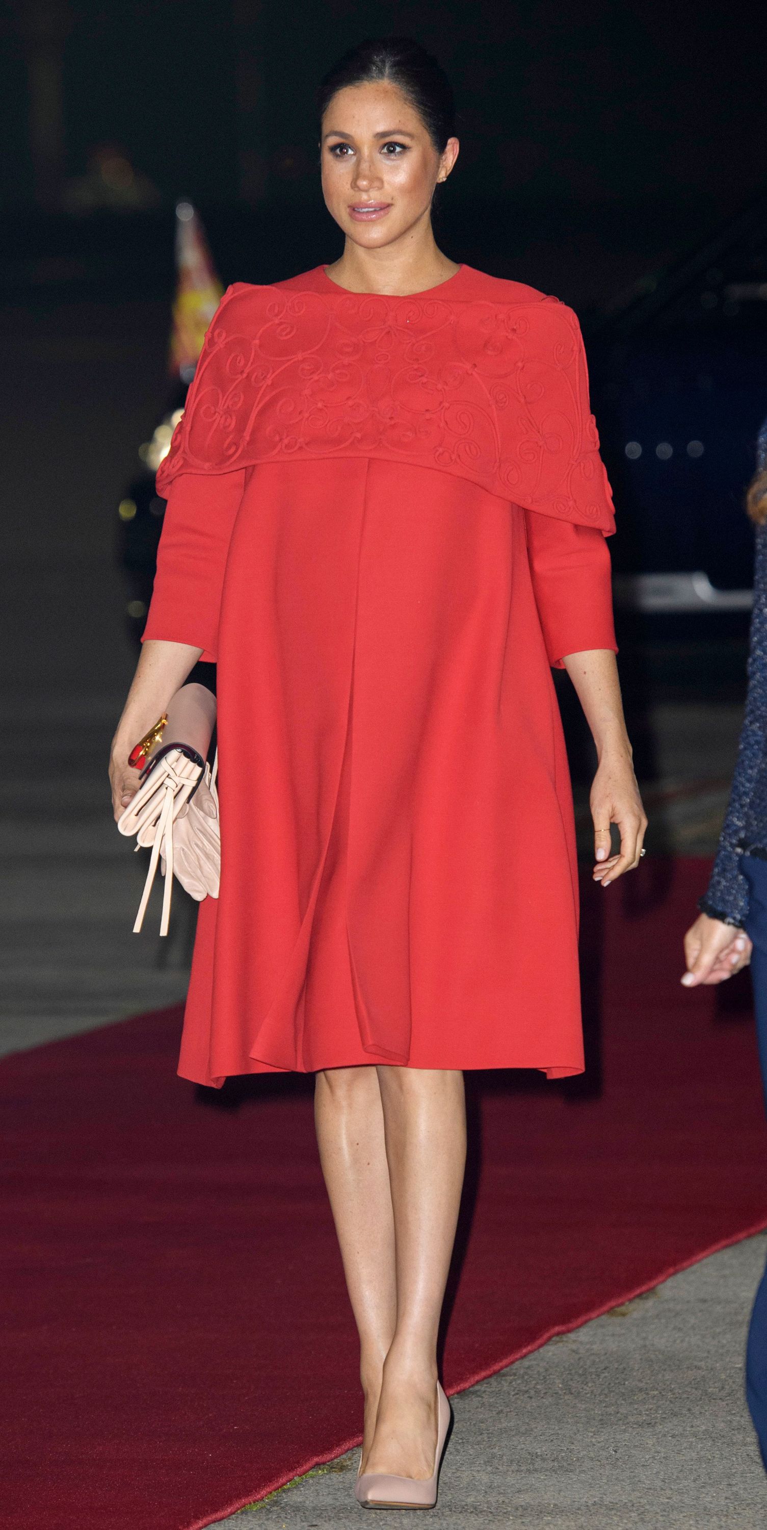 Bár várandóssága elején még úgy tűnt, Katalin hercegnéhez hasonlóan ő is a rövid ruhákat fogja előnyben részesíteni, végül nem így lett. Leggyakrabban midi és maxi szoknyákban, illetve nadrágokban láthattuk Meghan hercegnét, amely alól üdítő kivételt képezett ez a bő szabású Valentino köpenyruha, amelyet szintén marokkói útjuk során viselt és aminek állítólag üzenetértéke is volt. A piros ugyanis a marokkói nemzeti zászló színe, ugyanakkor a bátorság, keménység és erő hármasát is társítják hozzá, így a választás nem csak divatozási szempontok alapján volt telitalálat.