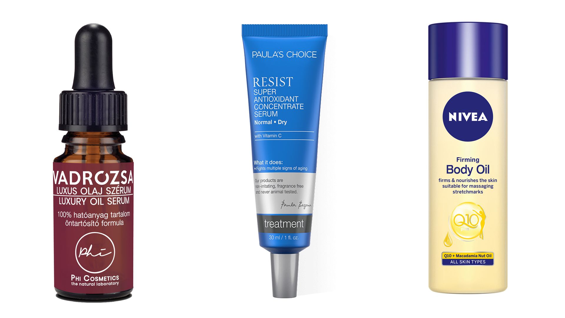 Phi Vadrózsa Luxus Olaj Szemkörnyékápoló Szérum – Paula’s Schoice Resist Super Antioxidant Concentrate Serum Arcszérum – Nivea Q10 Plus Bőrfeszesítő Olaj