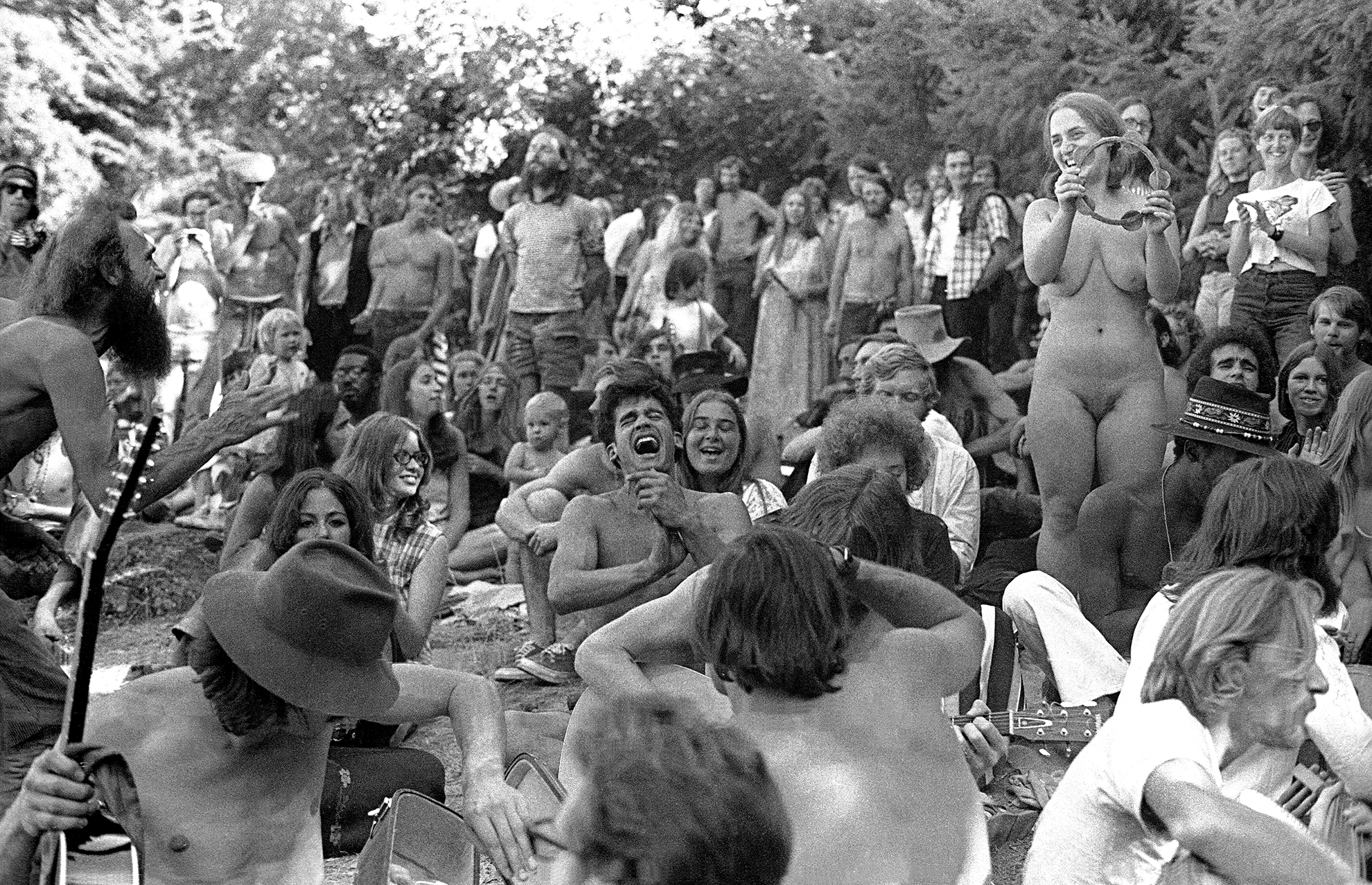 Meztelen nő tamburinnal egy hippirendezvényen, 1969 augusztusában (Fotó: Robert Altman / Michael Ochs Archives / Getty Images)