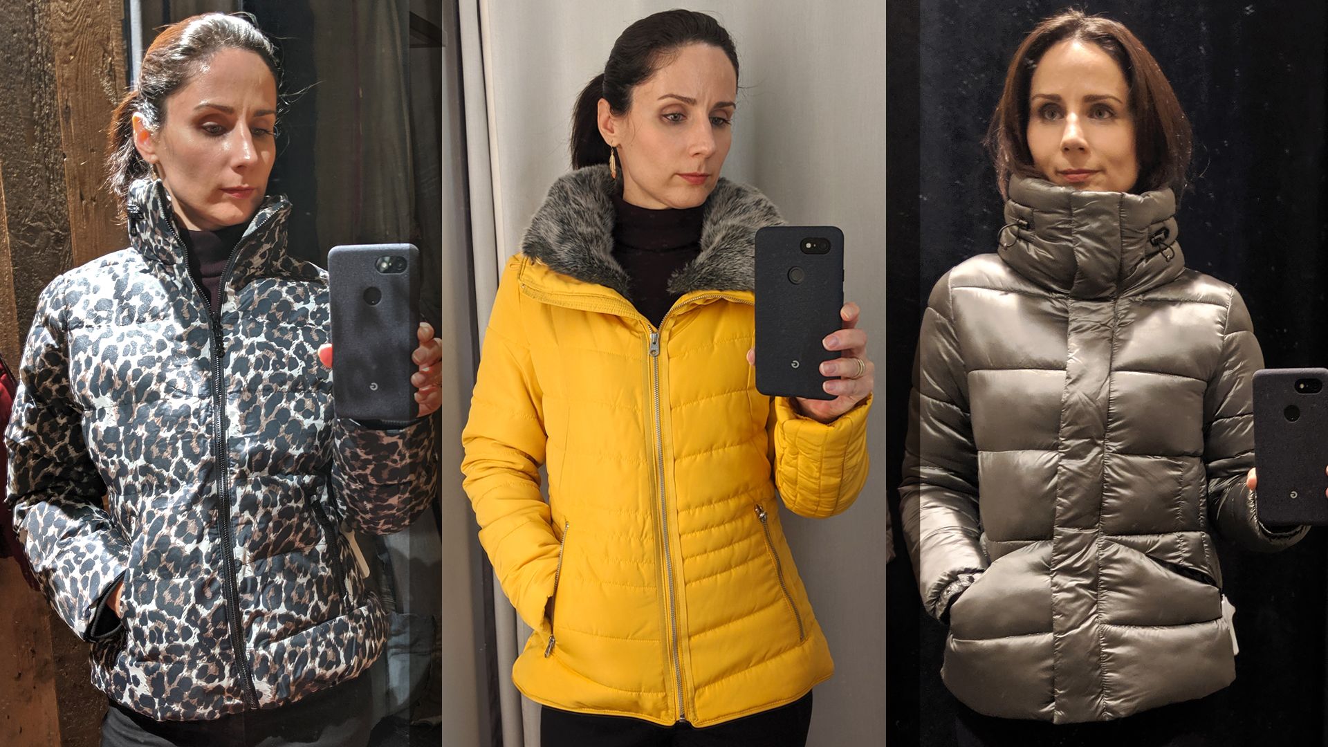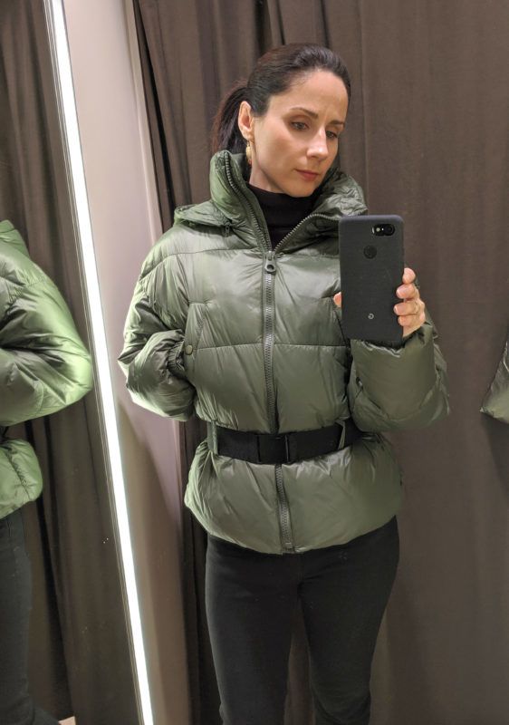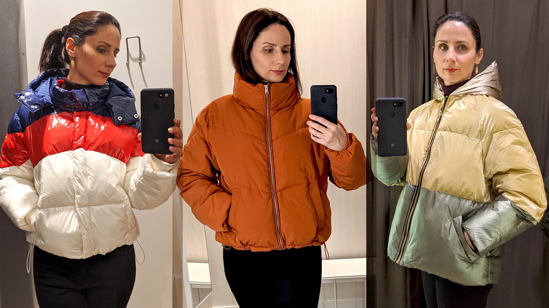 Nejlonzsák nem csillog úgy, mint ez a sportos pufidzseki. (C&A) / Ez a puha dzseki se nagyon védi a derekat. (H&M) / Egy szaloncukor minden csillogása rajta volt ezen a kabáton, ami sátor módjára állt el alul (Zara) (Fotók: Benecz Judit)