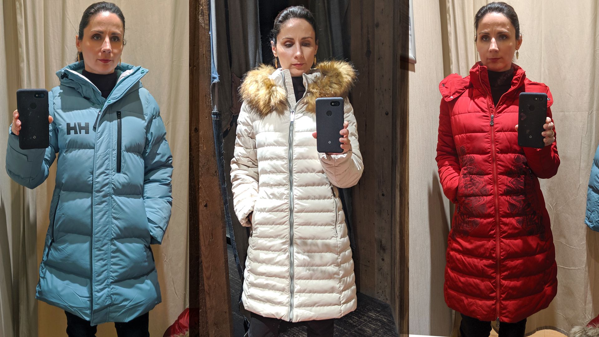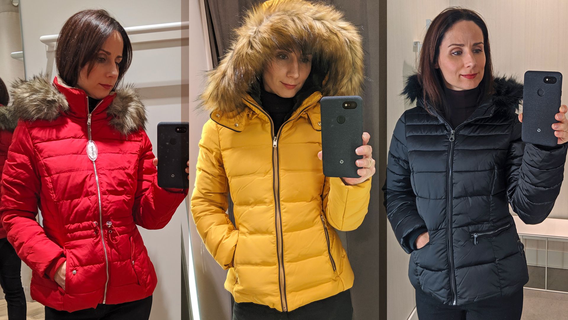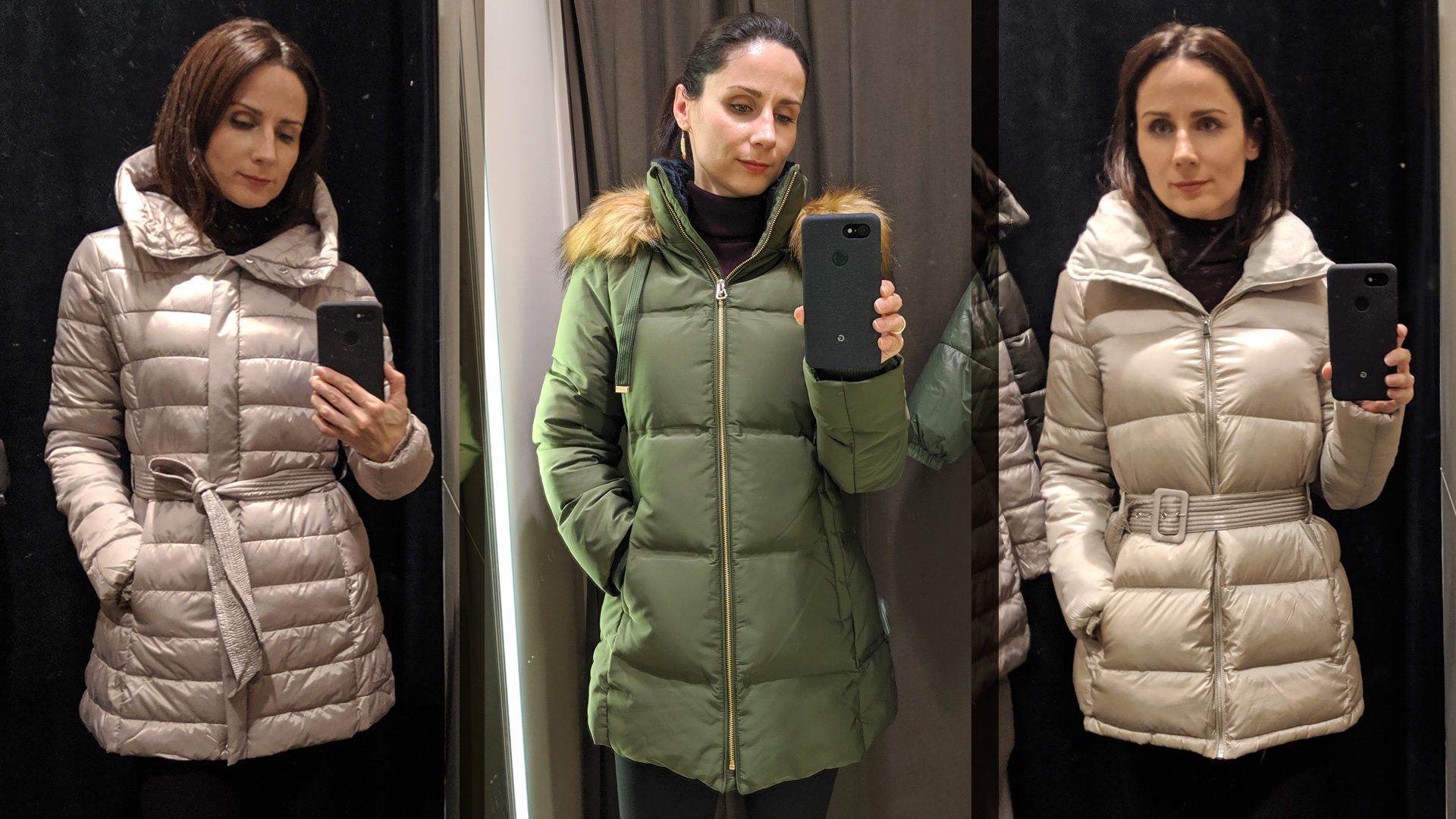 Nagyon puha anyagú, kevésbé kipárnázott télikabát. Megkötős öv helyett szebben mutatott volna csatossal (Mango) / Kényelmes, nagyon meleg, minden szempontból szuper kabát, aminek még a műszőrméje is szép volt (Zara) / Hasonló fazon, mint az első, vastagabb kiadásban, szebb övvel (Mango) (Fotók: Benecz Judit)