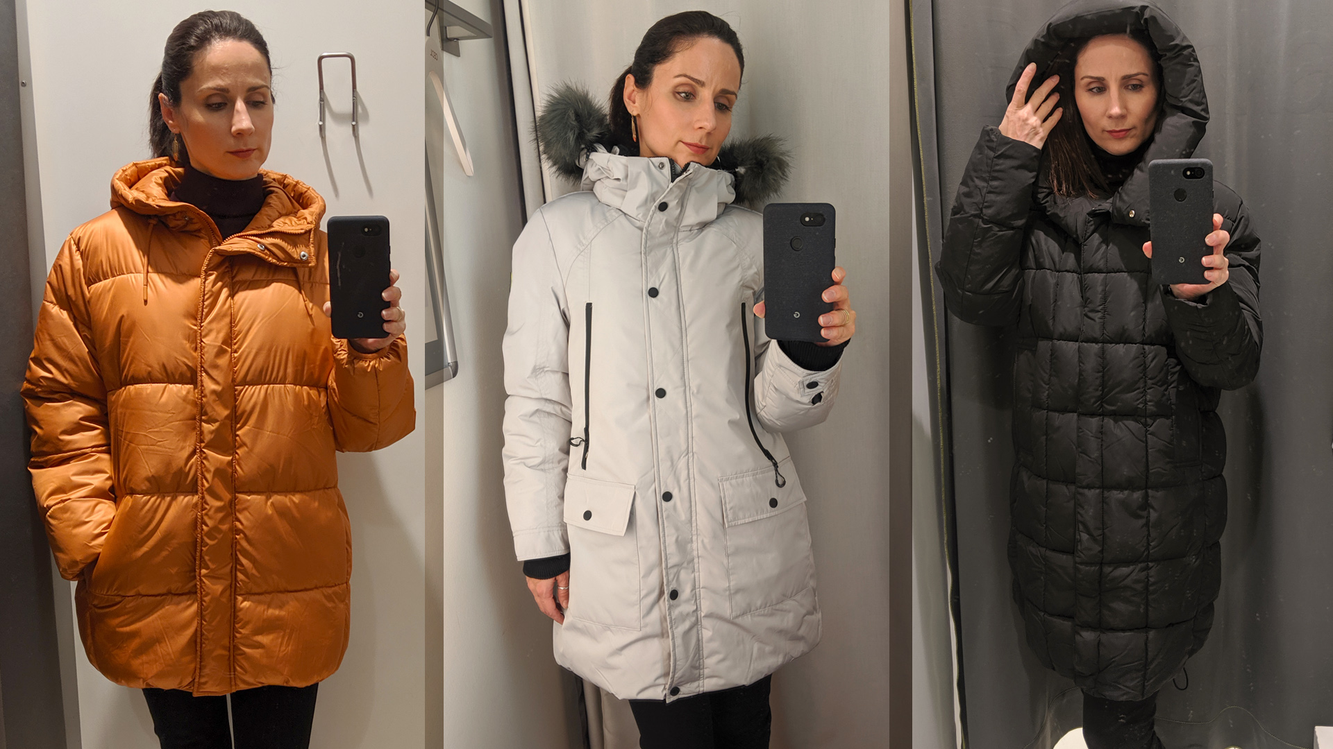 Abszolút bő fazonú, hosszított gömbkabát élénk narancsos színben (C&A)/ Ez a világosszürke sportos kabát szőrme nélkül is nagyon szép volt – kipróbáltam, legombolható (Cecil) / Némileg alaktalan voltam ebben az egyenes fazonú kabátban, más színben talán mutatósabb lett volna (Bershka) (Fotók: Benecz Judit)