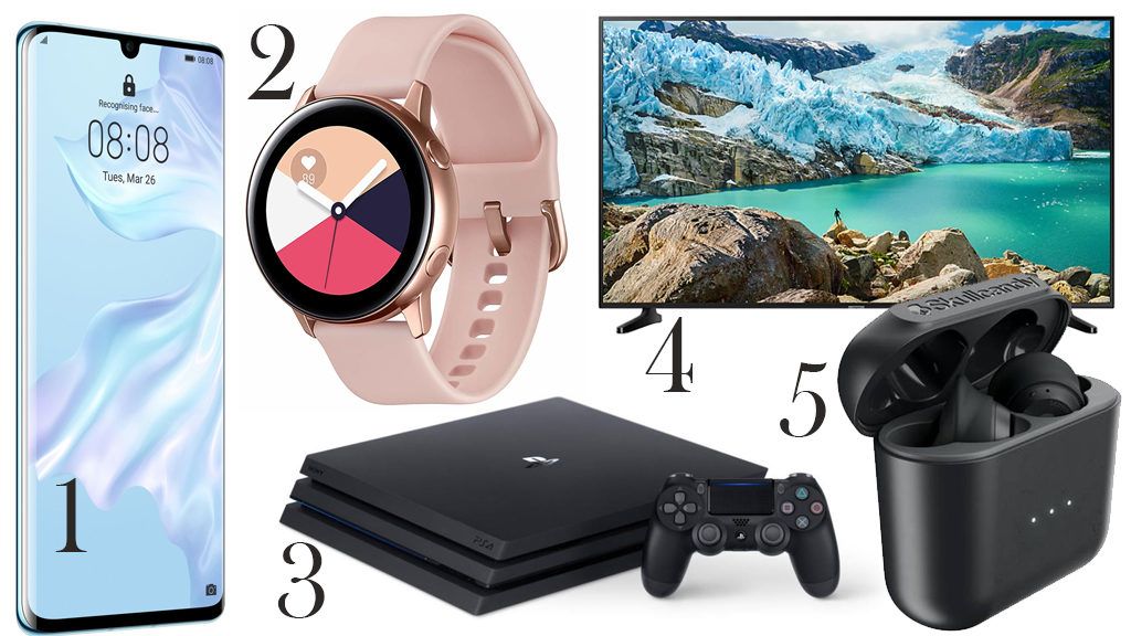 1. P30 Pro mobiltelefon – Huawei / 2. Galaxy Watch Active okosóra – Samsung / 3. PlayStation 4 Pro – Sony / 4. 4K UHD televízió – Samsung / 5. Indy True Wireless fülhallgató – Skullcandy