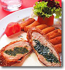 A parajt vajon, 1 gerezd fokhagymával, 1 dl fehérborral, sóval ízesítve megpároljuk. A pulykamellet felszeleteljük, kiklopfoljuk, sózzuk, majd a levétől kinyomkodott parajt elosztjuk a szeleteken, és felgöngyöljük. Az így elkészített húsokat szezámmagos morzsába panírozva, bő, forró olajban megsütjük. Ferdén félbevágva, sajtmártással és burgonyakrokettel tálaljuk.