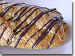 A táblacsokoládéból 4 csíkot (kb. 8 dkg) apró darabokra vágunk. 1 csík csokoládéból forgácsokat faragunk. A leveles tésztát hagyjuk felengedni, és lisztezett deszkán kb. 32 cm átmérőjű kerek lappá kinyújtjuk. Sütőpapírral kibélelt tepsibe fektetjük, és 8 cikkre osztjuk. A csokoládédarabokat a cikkek szélesebb felére halmozzuk, majd a tésztadarabokat egyenként feltekerjük. A tojássárgáját a tejszínnel elkeverjük, és megkenjük vele a croissant-okat. Előmelegített sütőben, 200 fokon (gáztűzhelynél 3-as fokozaton) 15-20 percig sütjük. A sütési idő vége felé esetleg letakarjuk. Vízfürdőben a maradék (kb. 2 dkg) csokoládét megolvasztjuk, és nejlonzacskóba töltjük. A zacskó egyik sarkán kis lyukat vágunk, és a kihűlt croissant-okra csíkokat rajzolunk. Végül csokoládéforgácsokkal megszórjuk.