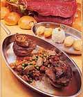 A bélszínt felszeleteljük, sózzuk, borsozzuk és a sütésig hűtőbe tesszük. A füstölt szalonnát, a zöldpaprikát, a paradicsomot, a gombát és a májat kb. 5 x 5 mm-es kockára, a vöröshagymát finomra vágjuk. A zsírt felolvasztjuk, hozzáadjuk a finomra vágott vöröshagymát és aranysárgára pirítjuk. A tűzről levéve megszórjuk a fűszerpaprikával, elkeverjük, hozzáadjuk az apróra vágott csontot, felengedjük vízzel és fél órán át pároljuk. A csontokat kiszedve a pörköltalapot finom szűrőn átszűrjük. A füstölt szalonnát kiolvasztjuk, hozzáadjuk a kockára vágott gombát, zöldpaprikát, paradicsomot, az előfőzött zöldborsót és a szárnyasmájat, majd az egészet együtt átpirítjuk – lehetőleg csak rázogassuk a serpenyőt és ne keverjük, mert a máj összetörik -, hozzáadjuk az átszűrt pörköltlevet, sózzuk és összeforraljuk az anyagokat. Amíg a ragu forr, a felszeletelt bélszínt felforrósított zsiradékban félangolosra sütjük. A megsütött szeleteket előmelegített tálra rendezzük és a raguval átvonjuk. Körete párolt rizs és bő zsírban sült hasábburgonya.