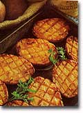 A burgonyákat gondosan megmossuk-sikáljuk, szárazra töröljük, hosszanti irányban kettévágjuk, és vágott felületüket, mint a pogácsa tetejét, mélyen bevagdossuk. Simára keverjük az olajat a mustárral, hozzáadjuk a meghámozott, áttört fokhagymát, a kakukkfüvet, ízlés szerint sót, frissen őrölt borsot, és megkenjük vele a fél burgonyákat. Nagyobb tűzálló tálba vagy kisebb tepsibe rakosgatjuk őket, és 180 °C- ra előmelegített sütőben, mérsékelt tűzön 40-45 percig, pirosra sütjük (ha nagyon pirulna a tetejük, alufóliával lazán betakarjuk, de át kell sülniük!). A sütőből kivéve néhány percig hűlni hagyjuk, tetejüket meghintjük finomra vágott petrezselyemmel, és azonnal tálaljuk. Igazán csak frissen jó!
