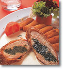A parajt vajon, 1 gerezd fokhagymával, 1 dl fehérborral, sóval ízesítve megpároljuk. A pulykamellet felszeleteljük, kiklopfoljuk, sózzuk, majd a levétől kinyomkodott parajt elosztjuk a szeleteken, és felgöngyöljük. Az így elkészített húsokat szezámmagos morzsába panírozva, bő, forró olajban megsütjük. Ferdén félbevágva, sajtmártással és burgonyakrokettel tálaljuk.
