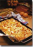 A kockatésztát sós vízben puhára főzzük, leszűrjük, leöblítjük, jól lecsepegtetjük. A sonkát apróra vágjuk vagy ledaráljuk. A tojásokat szétválasztjuk. A tojássárgákat az olajjal és a tejföllel kikeverjük, sózzuk (enyhén), borsozzuk, hozzáadjuk a főtt tésztát, a sonkavagdalékot, összekeverjük. A tojásfehérjét kemény habbá verjük, és lazán a tésztás masszához keverjük. Tűzálló tálat vagy tepsit kikenünk zsírral, megszórjuk zsemlemorzsával, és az összekevert sonkás tésztát beleöntjük, elsimítjuk. Előmelegített sütőbe téve lassan aranysárgára sütjük. Forrón tálaljuk. Valamilyen salátát adjunk hozzá.