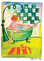 Azt nem tudom, hogy a Walt Disney-figurák és pikachuk versenyében mennyire piszkálja meg a gyermekember fantáziáját, de egy biztos, jómagam gondolatainak szokványos menetén jócskán penderítenek egyet-kettőt Bojtor Vera majd mindig napsugaras univerzumának fura kis lakói. Ahol a fürdőszoba hogyan is lehetne mással csempézve, mint klasszik kockás (persze tudjuk, hogy csak négyzethálós, de a matekfüzet óta az már csak kockás) csempével, s melyben a lábas fürdőkád mellé kötelező jelleggel dukál a habfürdő és a sárga gumikacsa. Ahol a legnépszerűbb bolygóközi jármű, a végtelenbe nyúló paszulyindákat és a papírrepülőket leszámítva, az egyfejű sárkánygyík, a kislányok és kisfiúk haja, sutba a gravitációval, rendszerint az ég felé nő (bár a bolygók gömbölydedségének köszönhetően az „ég felé” Bojtor Vera esetében igen relatív, holisztikusan szemlélendő fogalom), s ahol a békakirály még egy békésen ringatódzó tavirózsára is reményteljesen tekinthet, megváltásban reménykedve. Bár akkor sincs semmi vész, ha a megváltás elmarad, maximum királykisasszony helyett megelégszik a madaras farkú oroszlánnal vagy a kangazsebből kikandikáló zsebibabával.