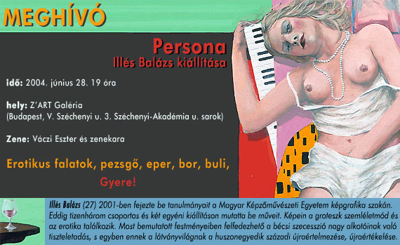 Hétfõn hét órakor a Z" Art Galériában nyílik meg a huszonhét éves festõmûvész elsõ kiállítása. Erotikus falatok, pezsgõ, eper, bor, buli. Zenél: Váczi Eszter és barátai. Izgalmas médiaesemény! Gyere!
