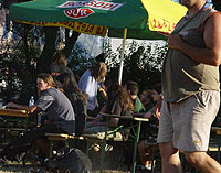 Soulfly felléptetéséről is, de ez végül kacsának bizonyult. Mindenesetre korrekt módon, már a jegyárusító lakókocsikon is kinn volt a figyelmeztetés, miszerint hiába jött mindenki, aki az amcsikra volt kíváncsi; más kérdés, hogy egy több száz kilométert utazó tájékozatlan rockrajongó nem biztos, hogy pusztán ezért visszafordul. Ennek ellenére, vagy épp ezért, elég kevesen voltak, ami szervezői szempontból drámai, én viszont külön élveztem, hogy a Sziget szokásos tömegnyomorával ellentétben itt végre rendesen el lehet férni, és még a nagyobb tömeget vonzó nagyszínpados fellépők koncertje alatt sem kell minduntalan könyököket operálnom a vesémből kifelé. A magamfajta öreg pesti klubharcos pedig szinte minden második sörpadnál találkozhatott valami fővárosi ismerőssel. Többek között ezért is kevésbé karmolom mostanában a rendszeresebb fesztivál-járást; nem túl felemelő az ország különböző pontjain, hétvégenként összefutni a Vörös Yukban cigit lejmoló punkokkal, de el tudom képzelni, hogy a rutinosabb fesztiválozókkal még a jobb arcmemóriával rendelkező, egyébként nem kifinomult modorról híres biztonságiak is kedélyesen elcsevegnek motozás közben, mondjuk az időjárásról.