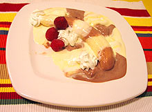 Ehhez a kehelyhez egy hosszúkás tálra lesz szükségünk, de megteszi egy tányér is, ha nincs más. A banánt hosszában vágjuk félbe, ezt fogjuk elrejteni. A rejtjelezéshez használjunk madártej és csoki Carte DOr Light jégkrémeket. Felváltva adagoljuk őket a banánok tetejére, hogy eltakarják. Ennél a kehelynél, amúgy olaszosan, ne gombóccal, hanem lapáttal adagoljuk a fagyit, így csíkos kenetek sorakoznak majd egymás mellett.