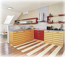 A tetőtér mint lakóterület eleve különleges, megengedi hát a formabontó megoldásokat mondja Müller Mónika. Ilyen ez a gipszkartonból épített falszakasz is, amellyel a hálórészt választottuk el valamennyire a tér többi részétől. Ez kiválóan alkalmas volt arra is, hogy a háló felől könyvespolcnak, a nappali felől pedig médiablokknak használható fülkéket alakítsunk ki benne. Mélyvörös árnyalata melegséget hoz a térbe, és szép kontrasztot alkot a pasztell színűre festett falakkal és mennyezettel. A tetőtéri ferde falakat, tértöréseket ez a világos árnyalat oldja valamennyire, a homogén festés magasabbnak, szellősebbnek mutatja a teret. Ilyen helyen inkább a padlón célszerű erőteljesebb árnyalatokat használni, ezért a laminált parketta markáns csíkozásával hangsúlyoztuk ki a funkciókat, jelöltük a közlekedő útvonalakat.