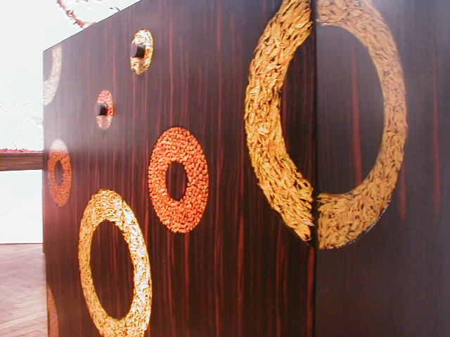 utóbbi időben. Láthattunk konyhai és háztartási tárgyakat, dísztárgyakat, rádiót, de még kályhát is. Egyik kedvencünk ez a finoman kidolgozott, szárított növényekkel berakott, és a retro 60-as évek szín- és formavilágát idéző bútor. A kiállítás legkedveltebb darabja a kerek pingpongasztal, melyről nehezen eldönthető, hogy lakásunk dísze vagy elengedhetetlen tartozéka-e.