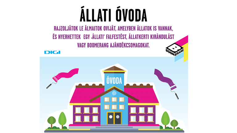 A fődíj mellett a második legjobb alkotás állatkerti kirándulást nyer, a harmadik pedig boomerangos ajándékcsomagokat. A pályázatra bármely magyarországi óvoda és/vagy óvodai csoport nevében jelentkezhet óvodapedagógus vagy akár szülő is. A feladat, hogy a gyermekek közösen készítsenek egy rajzot, festményt, kollázst, montázst, mozaikképet vagy bármilyen más alkotást, a lényeg, hogy megmutassák rajta, hogyan képzelik el Állati Óvodájukat. Az elkészült alkotásokról a fényképet legkésőbb 2017. április 30., vasárnap éjfélig kell feltölteni a DIGI weboldalára: www.digi.hu/allatiovoda. A beérkezett pályaművekre a Facebookon keresztül lehet szavazni április 18. és 30. között. A 10 legtöbb szavazatot kapott alkotás ezután egy szakmai zsűri elé kerül, akik kiválasztják a három nyertes óvodát. A nyertesek május 5-én, a DIGI facebook oldalán kerülnek kihirdetésre.